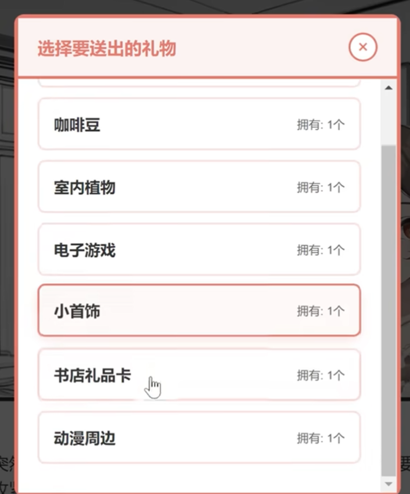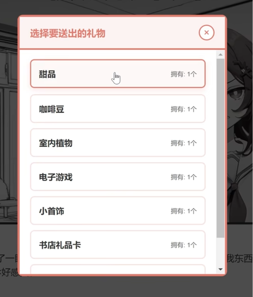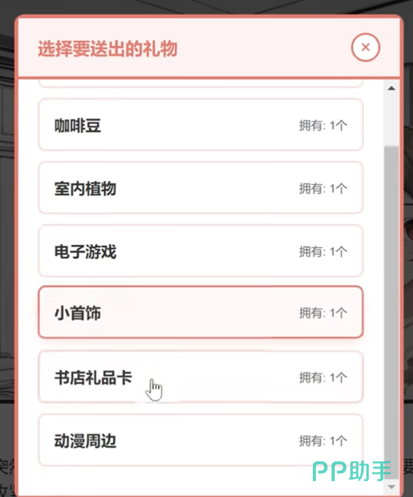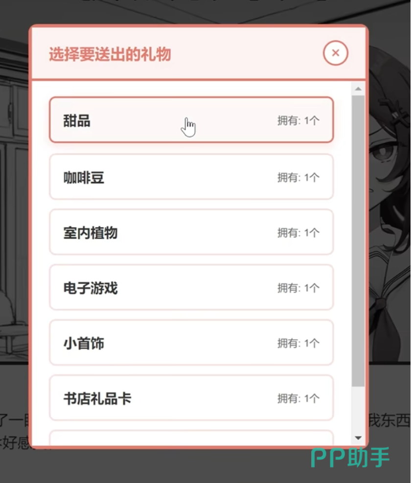 游戏内礼物按功能维度划分为三大体系:基础馈赠类、情境联动类与AI偏好推荐类。基础馈赠类涵盖日常高频物品,如巧克力(+2好感)、糖果(+1好感)、甜品(+3好感)、小首饰(+2好感)、书店礼品卡(+3好感)及书籍(+3好感)。每种物品对应固定好感增幅,数值不可叠加,重复赠送同类型礼物将触发性格倾向变化机制——例如连续赠送甜品类达5次后,妹妹可能向“贪吃”或“活泼”方向微调。