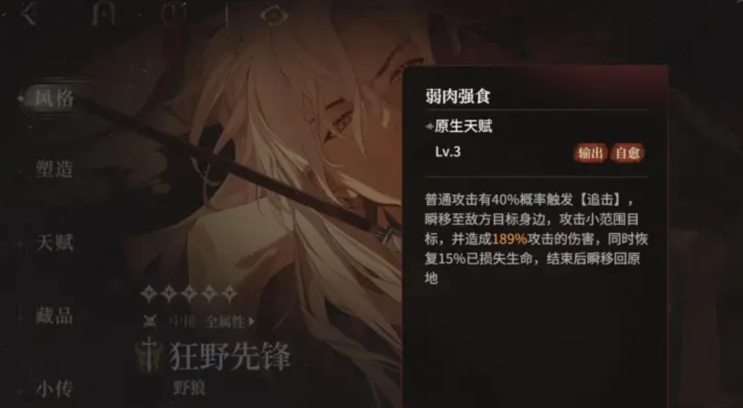 作为持续输出体系中的核心成员,野狼具备极强的追击能力。其技能“弱肉强食”使普攻有40%概率触发“追击”效果,可瞬间位移至敌人身边,对周围小范围目标造成伤害,并回复自身已损失生命值的15%,攻击完成后自动返回原位。大招释放距离较短,通过利爪突进至敌方单位身旁,发动六段连击,每段命中均有25%几率附加流血状态。当自身生命值低于30%或持续时间达10秒后,将回归初始位置。处于流血状态的目标每秒承受相当于69.3%攻击力的持续伤害。