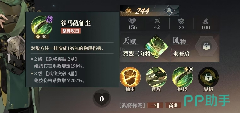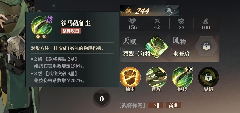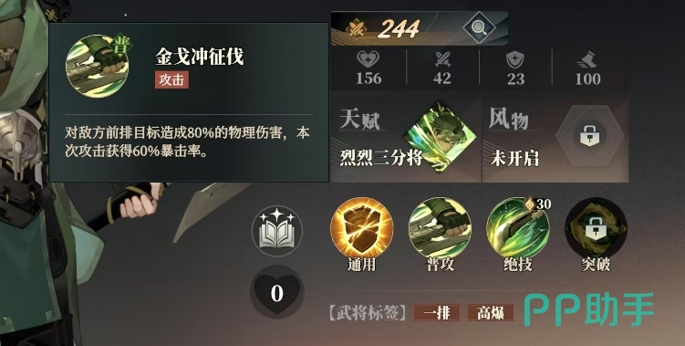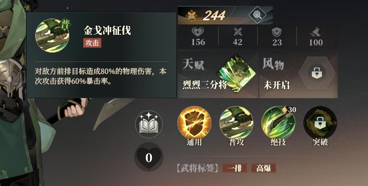 关平的普攻名为金戈冲征伐,这一技能当他发动普攻时,能够对敌方前排目标造成80%的物理伤害,更为关键的是本次攻击还能获得60%的暴击率,这大大提高了他在战斗中的输出潜力,而他的绝技铁马截征尘更是威力惊人,这一技能带来的是整排攻击效果。
