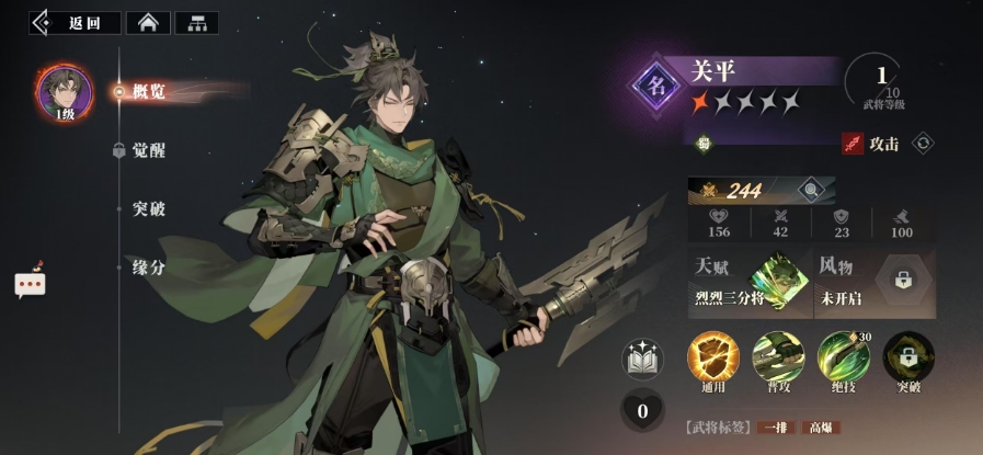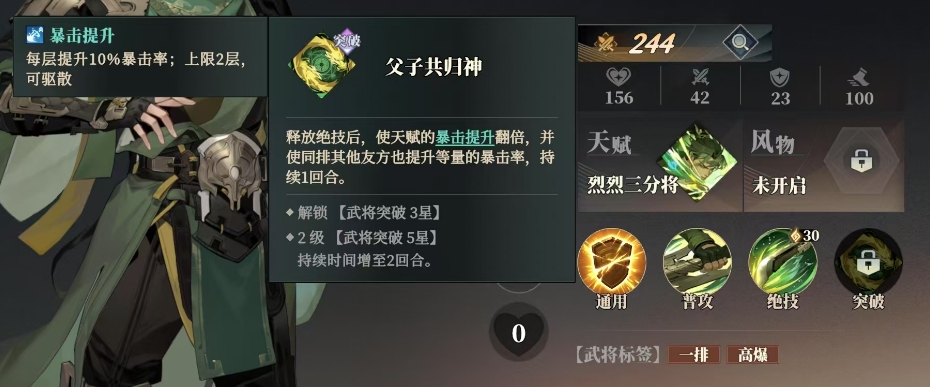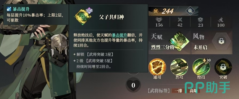 关平的突破技能叫做父子共归神,这个技能在武将突破3星的时候解锁,它的效果十分独特,在释放绝技后不仅能够使天赋的暴击提升翻倍,还能让同排其他友方也提升等量的暴击率,持续1回合,这一技能的存在使得关平在团队作战中发挥着重要的作用,能够提升整个团队的暴击率,从而增加团队的整体输出能力,当达到2级武将突破5星时,持续时间增至2回合,进一步增强了这一技能的效果,此外关平的暴击提升还可以每层提升10%的暴击率,上限为2层,这意味着他在战斗中能够不断地积累暴击率,进一步提高自己的输出能力。