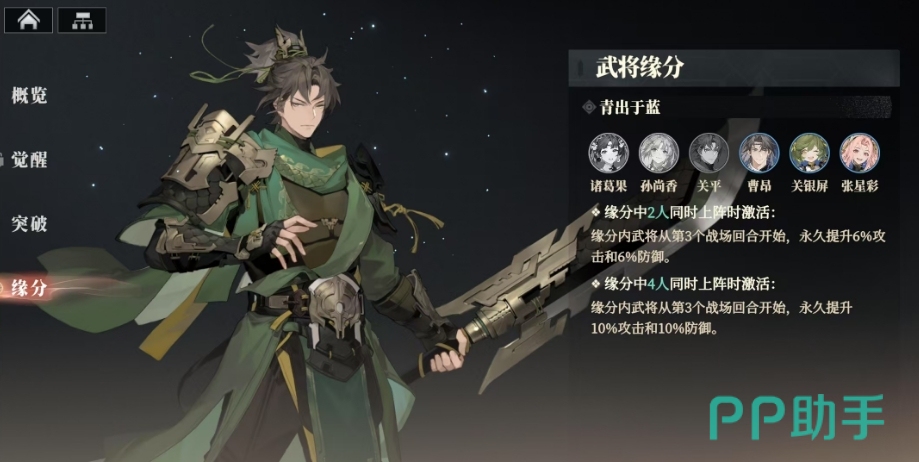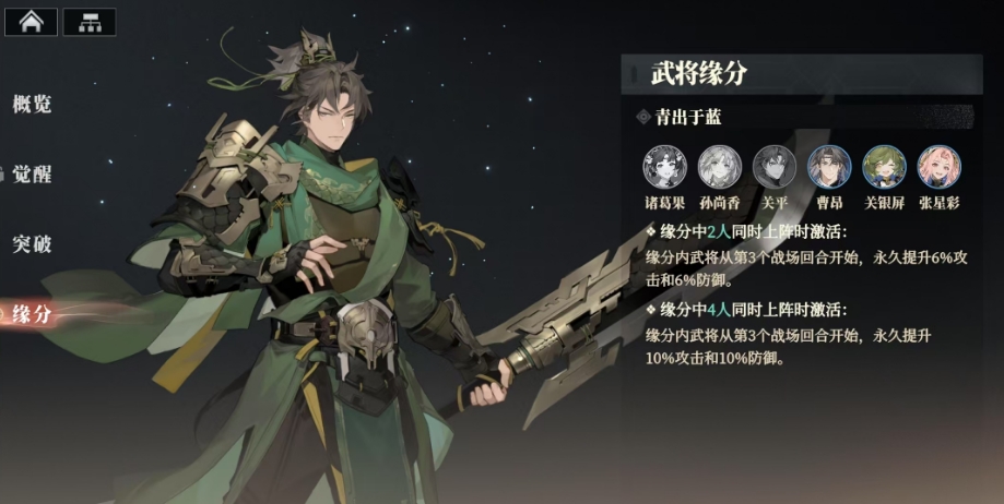关平的武将缘分是青出于蓝,与他有着紧密羁绊的是诸葛果、孙尚香、关银屏、张星彩这几个人,当缘分中2人同时上阵时,便会激活特殊的缘分效果。缘分内武将从第3个战场回合开始,会永久提升6%攻击和6%防御,而当缘分中4人同时上阵时,缘分内武将从第3个战场回合开始,会永久提升10%攻击和10%防御。