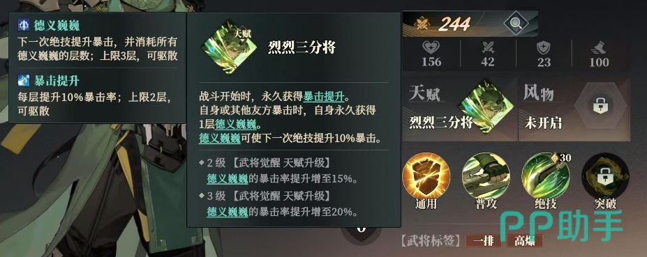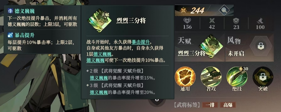 烈烈三分将是关平的天赋效果,这一天赋赋予了关平非凡的战斗能力,在战斗开始时,关平会永久获得暴击提升,这让他的攻击更具杀伤力,无论是自身还是其他友方暴击时,关平都会永久获得1层德义巍巍,德义巍巍是一种强大的效果,它能够让关平的下一次绝技提升10%的暴击率。当达到2级武将觉醒天赋升级后,德义巍巍的暴击率提升增至15%,而当达到3级武将觉醒天赋升级时,德义巍巍的暴击率提升增至20%。