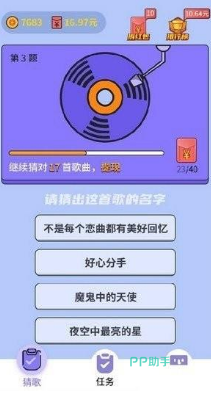 一款充满乐趣的休闲益智手机游戏,它精心收录了上百首涵盖各种风格、语言和节奏的歌曲,每一首都是广为人知的流行佳作与经典老歌。游戏中设有闯关、挑战、歌词等多种趣味玩法,让玩家尽情享受猜歌的乐趣。猜歌大赢家支持双人PK模式,边猜歌边回味那些熟悉旋律,让乐趣加倍。在玩游戏的同时,也能欣赏到美妙的音乐。仔细聆听每一首歌,从众多文字中找出歌曲的名字,享受猜歌的过程。