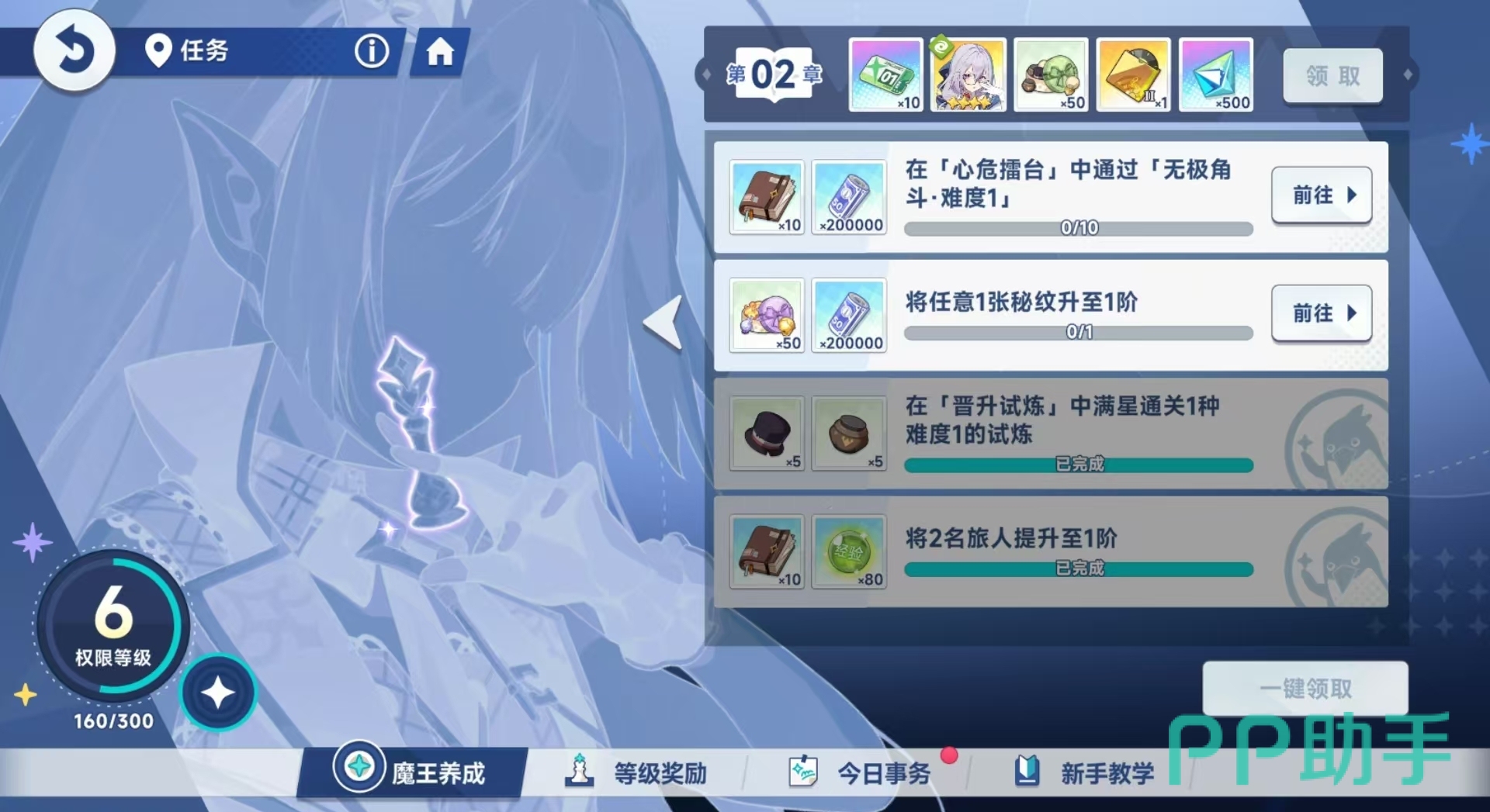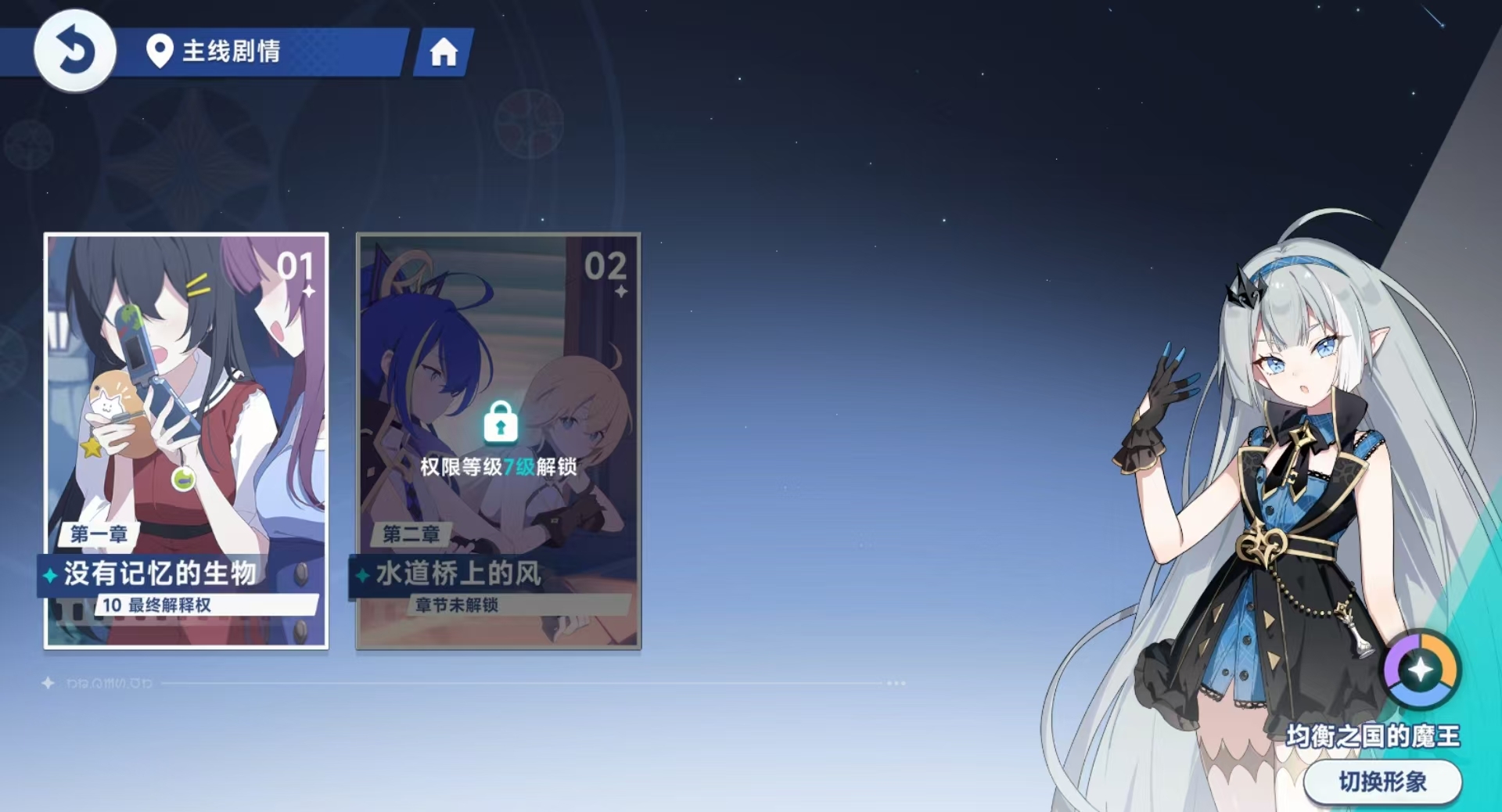 游戏开局会引导玩家经历一段强制剧情流程,在此过程中逐步熟悉基础操作与战斗系统。完成引导后即可进入自由探索阶段,正式开启开荒进程。此时最核心的目标是提升“魔王养成”中的权限等级——该等级直接影响可解锁的内容范围,包括主线章节、玩法功能以及资源获取量。权限越高,开放内容越丰富,因此优先提升此项指标至关重要。与此同时,建议同步推进主线任务,本作剧情以视觉小说形式为主,穿插少量战斗挑战,每完成一个章节节点还可获得星之砂奖励,助力后续角色抽取。