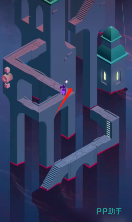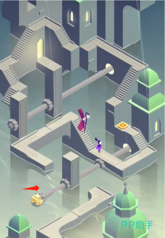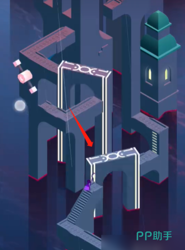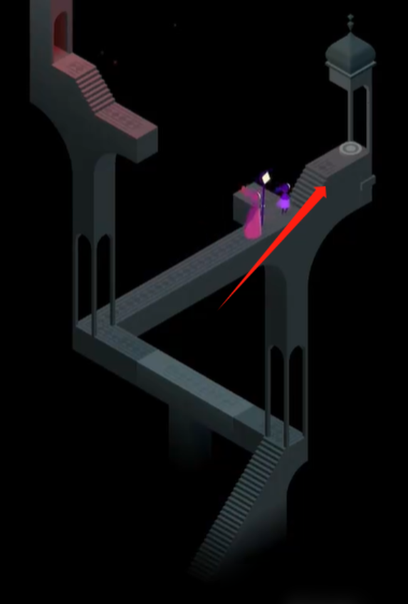 随后进入核心机关区:先激活升降装置,使新断桥缓缓升起;再将其横向拖拽至中央悬空位,确保两端落点与左右通道完全对齐。角色沿桥上行,经由一段固定斜坡继续推进,最终抵达神殿正门。操作中需注意断桥朝向——仅当其轴线与相邻路径保持一致时,连接才被系统判定为有效。