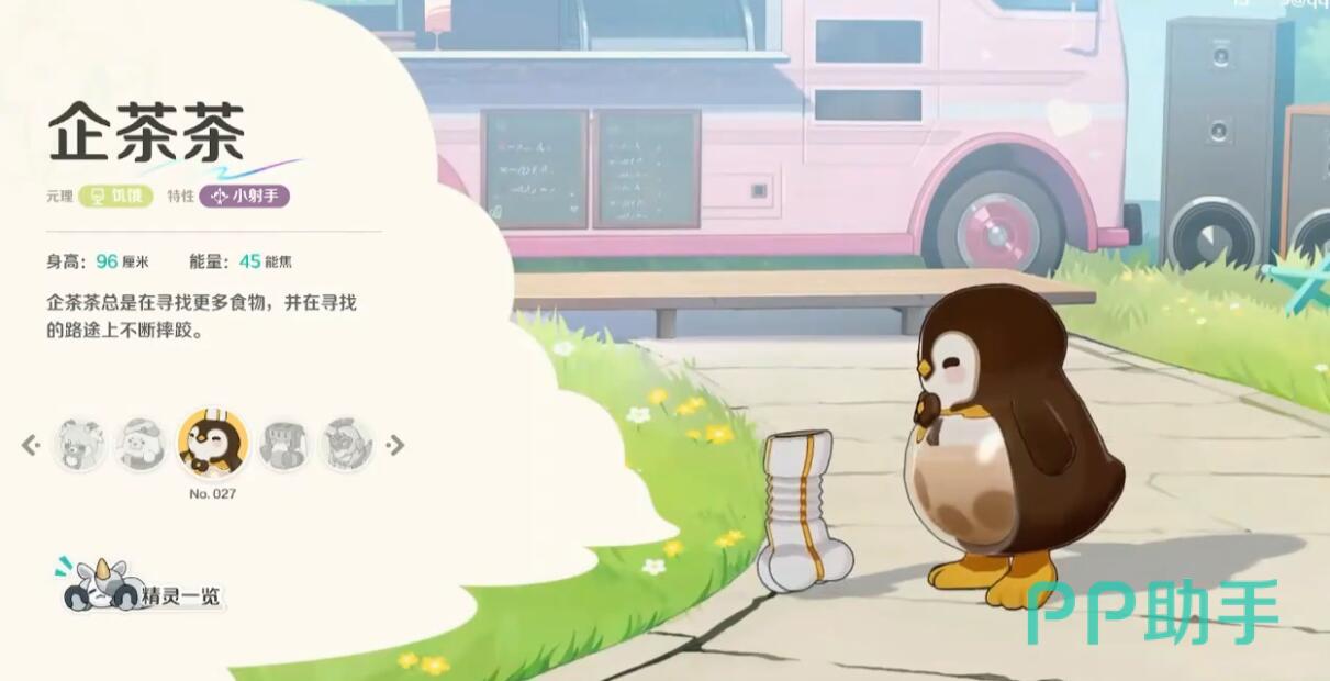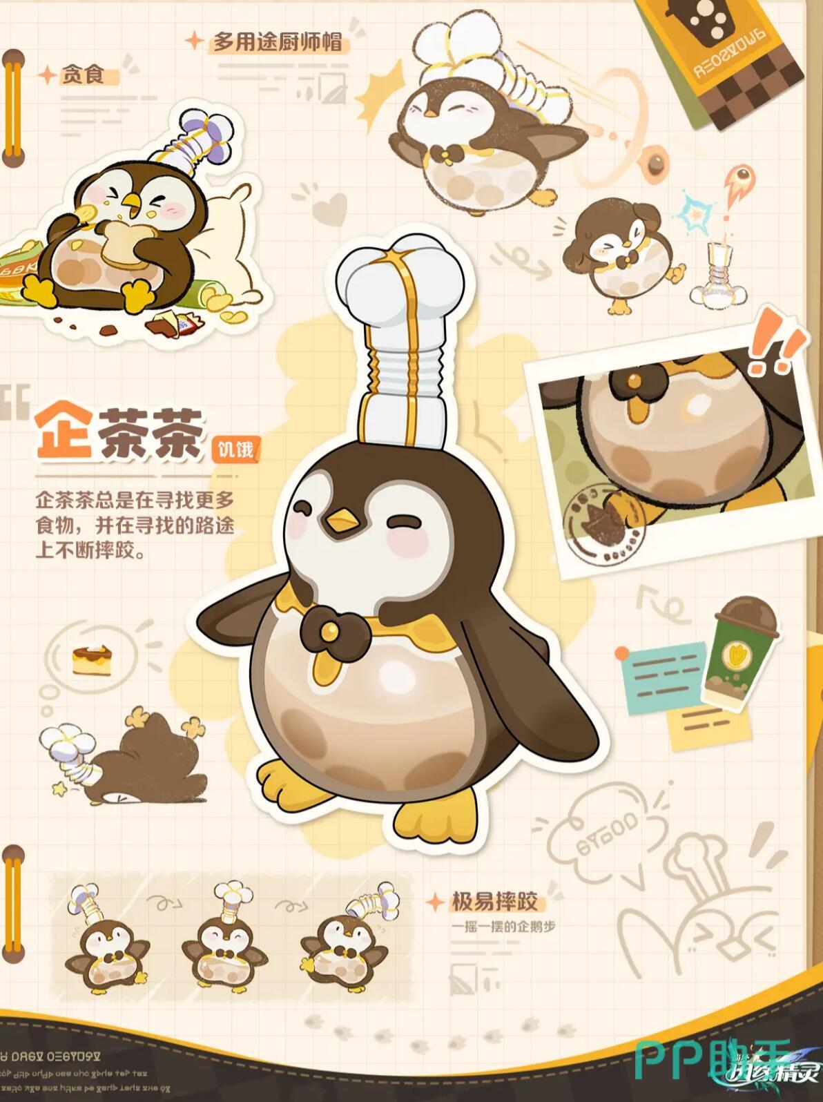 企茶茶整体形象为圆润可爱的企鹅形态,通体覆盖洁白羽毛,颈部佩戴一条清新的绿色茶系围巾,手持形似厨师帽的杯状武器,双颊泛着淡淡的红晕,视觉上极具亲和力。据背景设定透露,它源自“茶之位面”,日常喜爱饮用并浸泡奶茶,常在茶馆中静静观察人类行为,性格悠闲自在。属性方面,结合企鹅的生物特征,推测其拥有冰/水双重元素属性,战斗定位偏向辅助类角色,擅长施加控制效果并为队友提供增益支持。