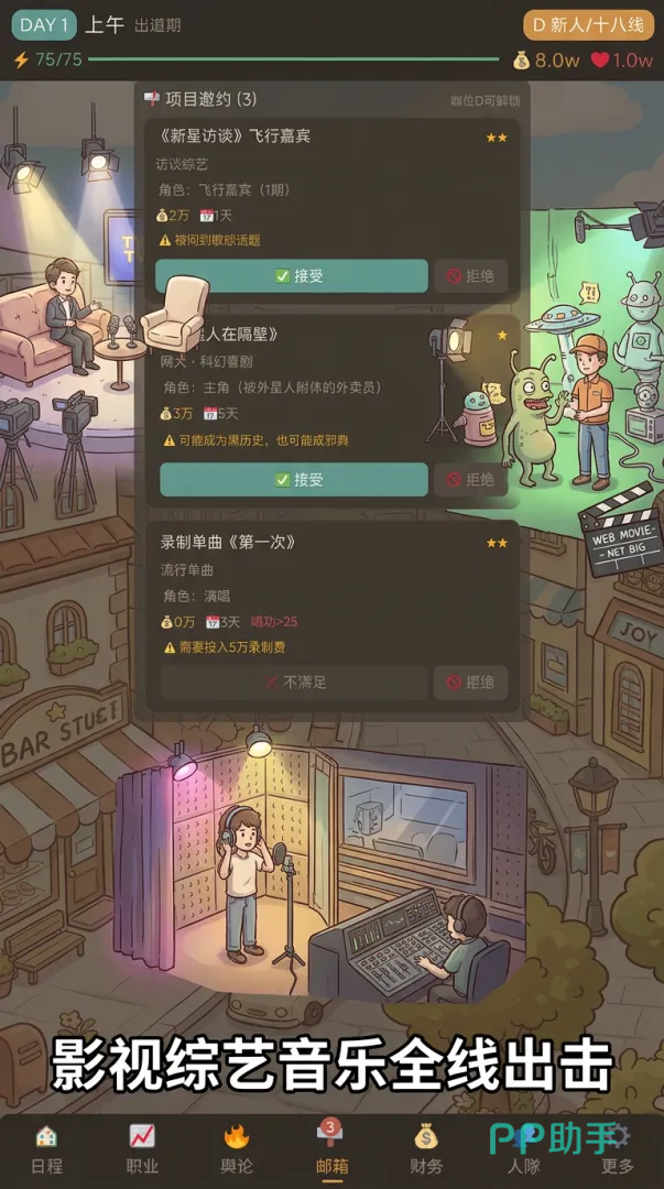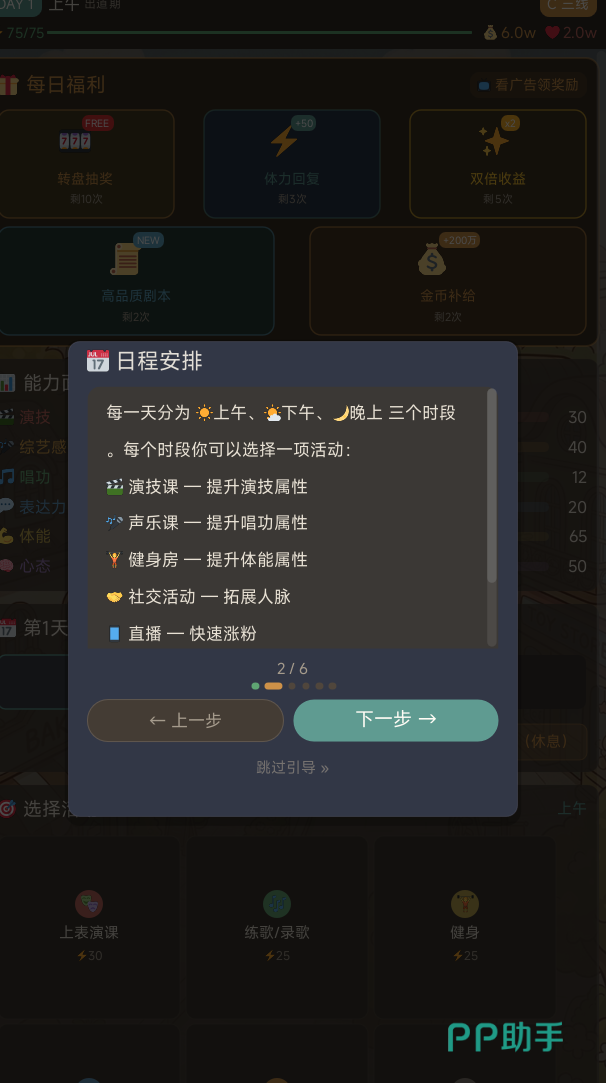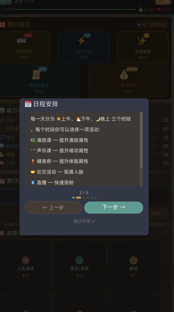 完成出道设定后,玩家将正式进入为期60天的明星生涯周期。在此期间,需同步推进三项核心目标:提升咖位等级、积累粉丝数量、获取商业收入,并在年终盛典中争取更高综合评价。游戏采用三段式日程系统——上午、下午、晚上,每个时段可选择一项能力训练活动,例如“演技课”用于提升演技属性;不同课程对应不同技能维度,建议依据所选出道方式匹配最优成长路径。