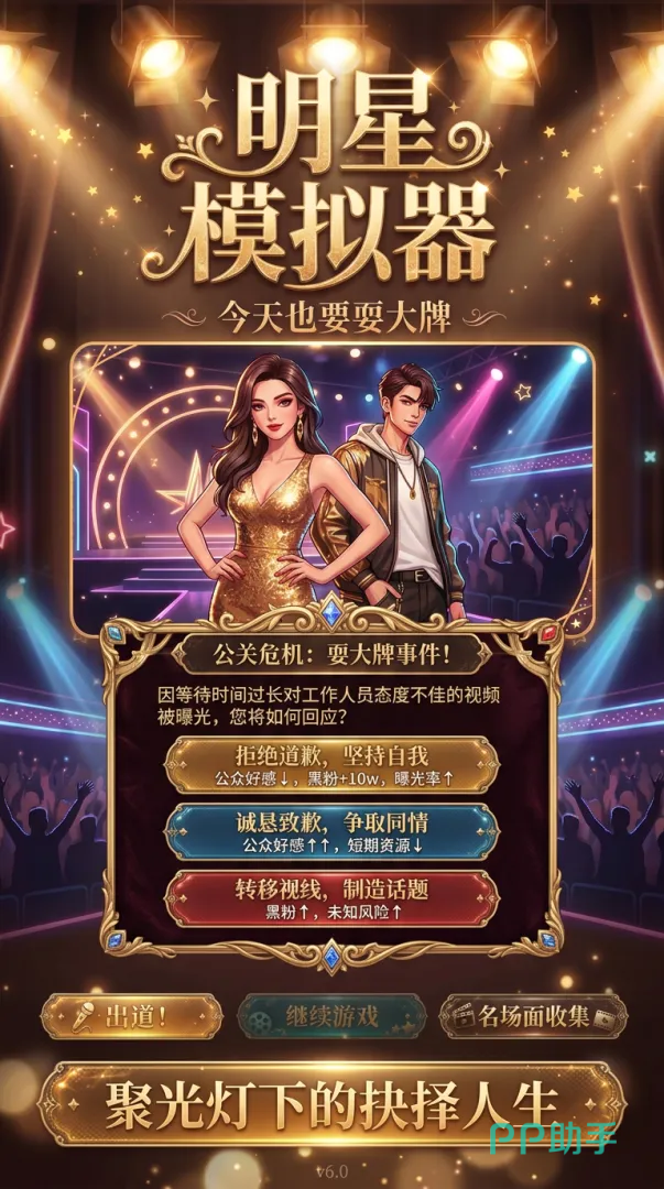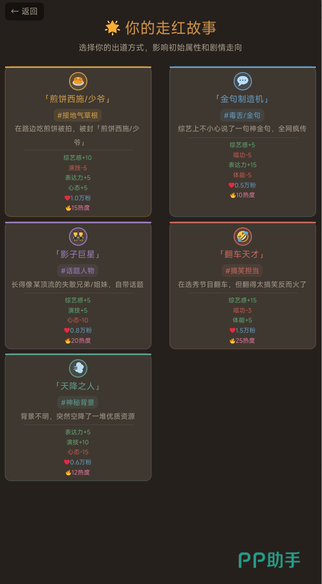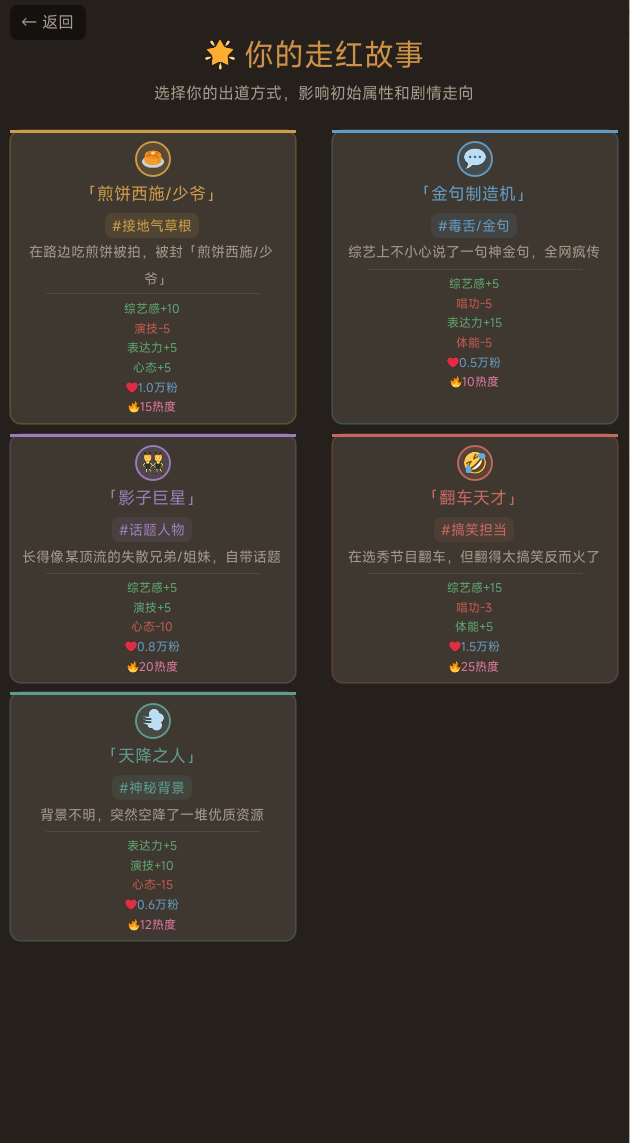 本作以素人逆袭为叙事主线,深度还原从无名到顶流的心理转变与行业生态。游戏内置五种差异化出道路径——“煎饼西施或少爷”“金句制造机”“影子巨星”“翻车天才”“天降之人”,每条路线对应独特的初始属性配置与专属剧情分支,直接影响后续60天明星生涯的发展节奏与结局走向,选择前需结合个人策略慎重决策。