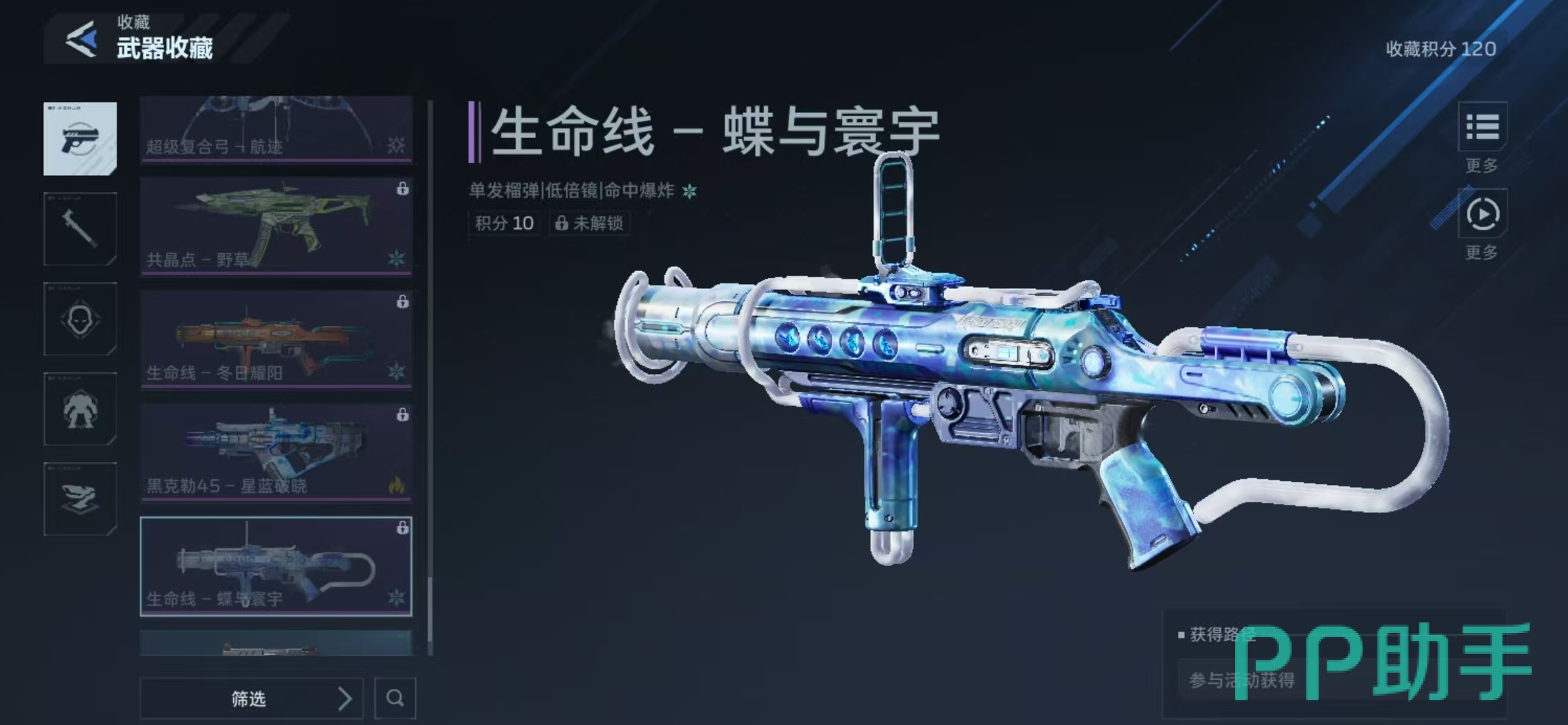 “蝶”与“寰宇”并非普通涂装,而是专为单发榴弹武器“生命线”定制的视觉主题皮肤。其建模细节丰富,动态光效细腻,在实战界面中辨识度极高,深受偏好高表现力外观的玩家青睐。值得注意的是,该皮肤不通过常规概率抽取(如开启宝箱)或直接付费购买获得,而是绑定于游戏首发阶段的核心运营活动——“杰哥发把枪”。