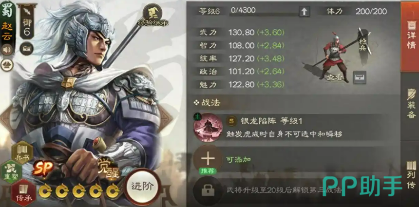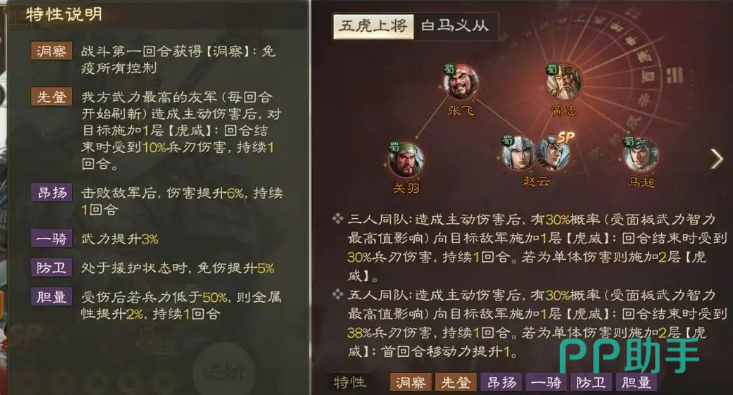 最后,赵云的特性进一步增强了他在战场上的作用。每当赵云攻击敌方时,他能给敌人附加“虎威”buff,极大增加了他战法触发的频率。配合传承的效果,这简直是一个完美的“虎威”滚雪球机制。赵云的这一特性让他在每一场战斗中都充满了爆发力,敌人根本无法承受他的连续打击。