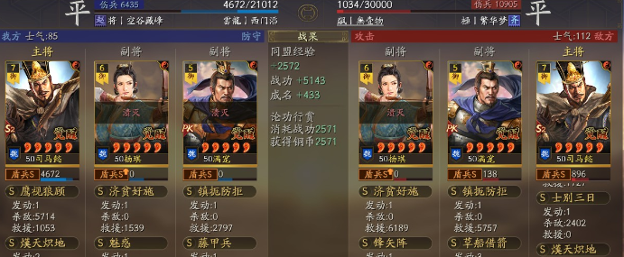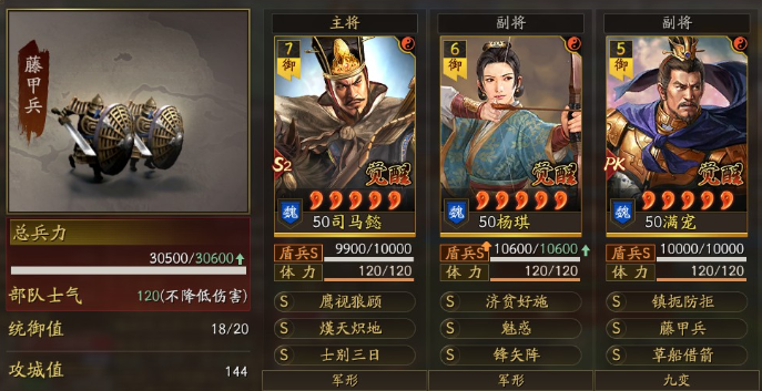 需注意的是,“四面楚歌”“沉沙决水”等以持续状态伤害为主的战法,受限于施加成功率、生效延迟及易被净化打断等固有缺陷,在飞熊司马懿的定位下并不契合。相较而言,“熯天炽地”不仅具备即发即中的输出稳定性,还能在SP周瑜、形一阵等协同体系中进一步放大伤害收益——当敌方处于减防、禁疗或虚弱状态时,司马懿的爆发伤害将获得实质性提升。