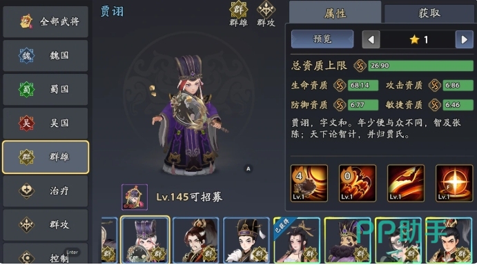 第三位重点培养对象:贾诩。作为中毒流体系的核心驱动者,其群体伤害系数在全游戏中位列前五。基础技能自带挂毒效果,且被动“毒蚀”可使对中毒目标造成的伤害提升18%;另一被动“晦影”则提供20%基础防御加成,并在受击时有35%概率反向施加3回合中毒状态。尤为关键的是,当贾诩对已中毒单位造成伤害时,自身所受伤害降低25%,形成攻防一体的战术闭环。实战建议优先升级其带毒附效的主动技能,以强化后续连招衔接效率。