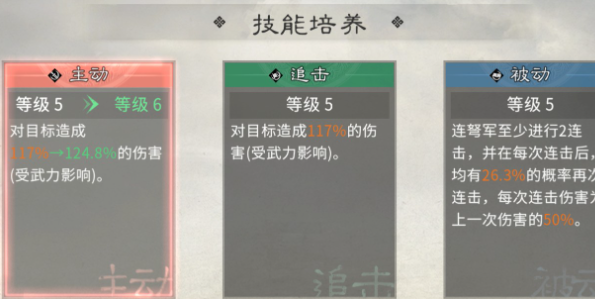 连弩军的强度核心源于其被动效果——完成两次基础连击后,后续每次普攻均可触发一次额外连击;虽该额外伤害衰减为前次的50%,但可连续多次触发,形成稳定滚雪球式输出节奏。为最大化此机制收益,建议将主动技能等级提升至5级或以上;当技能满级时,单次主动攻击可造成124.8%的系数伤害,配合被动叠加,整体DPS稳定性显著优于多数同阶兵种。在属性成长路径上,“根基固实”为首选强化方向,该属性可同步提升攻击力、防御力与生命值,使连弩军兼具输出能力与战场生存韧性。