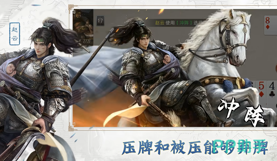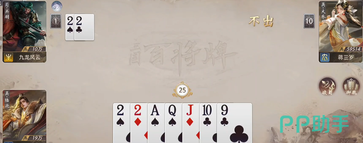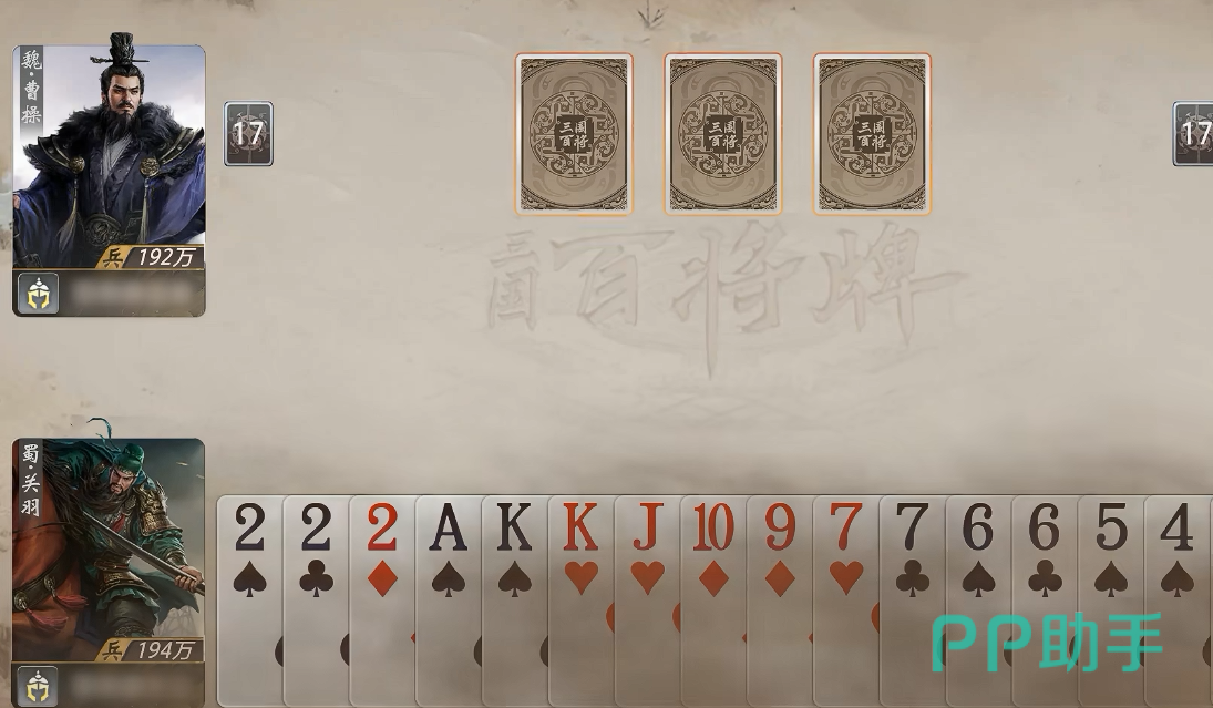 除基础牌型外,武将技能系统构成差异化核心。每位武将技能均依据其历史形象与战术定位设计,例如关羽“武圣”技能聚焦顺子机制——当对手打出顺子时,可强制抽取其手牌库中一张牌进行干扰;己方打出顺子时,则可消耗万能牌提升连击强度,并支持与装备效果联动,实现多段连续压制,显著增强操作深度与临场博弈感。