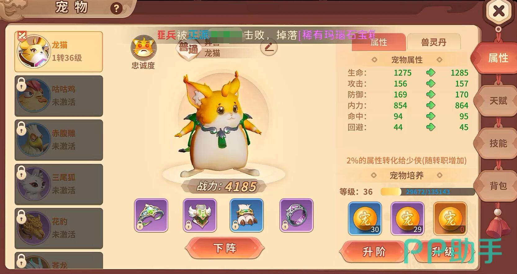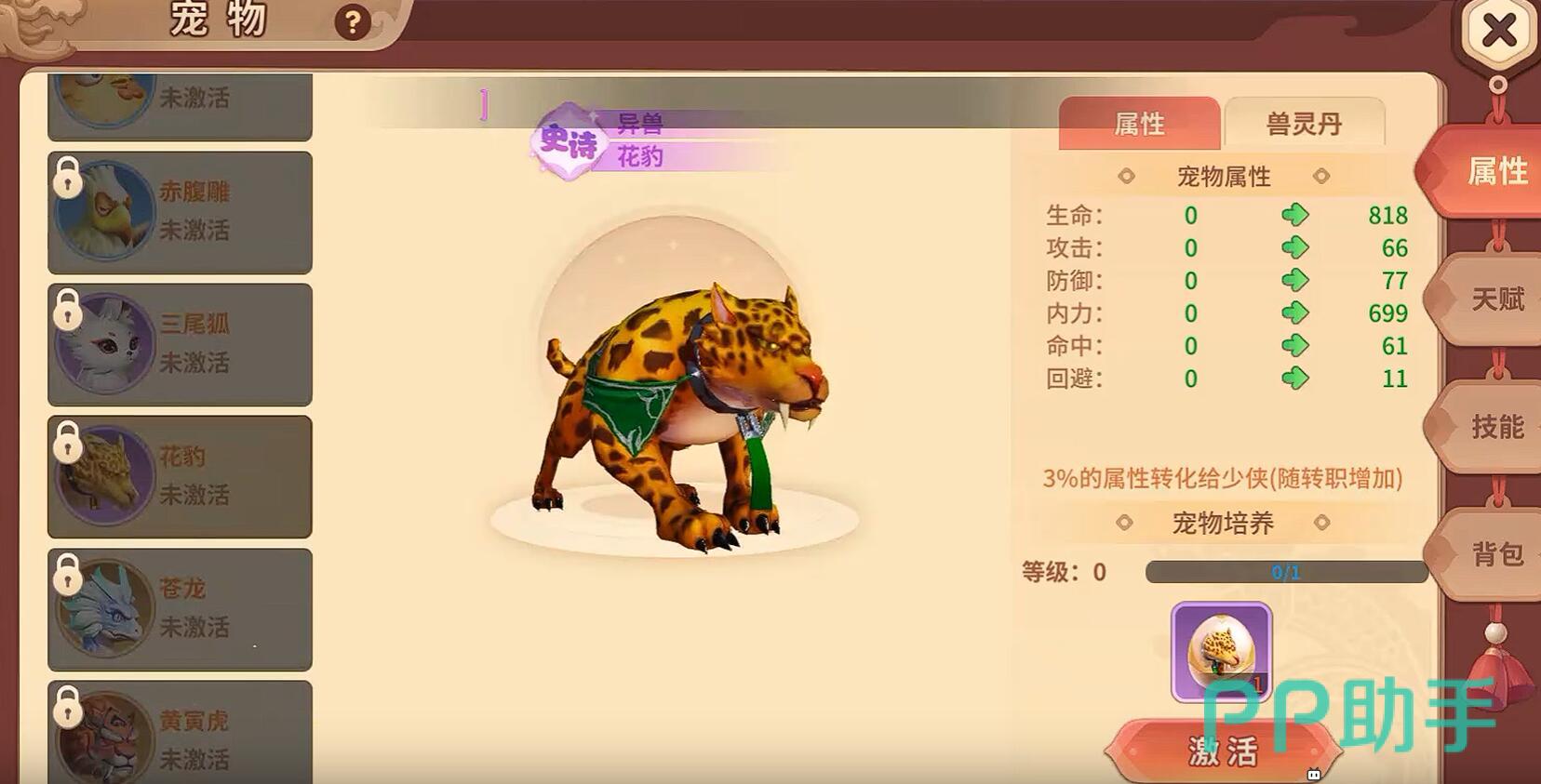 龙猫、赤腹雕、花豹和黄寅虎为游戏中四大主力宠物,整体强度位列T0梯队,品质随种类递增。其中,花豹拥有“致命链接”天赋,可使单体输出职业获得群体伤害加成;黄寅虎则具备“战意威慑”能力,有效降低敌方单位的攻击力。宠物升级可通过参与战斗获取经验或使用升级丹完成,随着等级提升,生命值、攻击、防御等基础数值均会同步增长。完成转生操作后,还可进一步提升专属天赋等级,强化特殊技能的实际效果。
