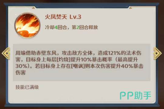 另一关键主动技“火凤焚天”拥有4回合冷却,最早于第二回合启用。该技能覆盖全体敌方单位,造成121%法术伤害,并依据目标当前所受嘲讽层数提供暴击率加成:每层嘲讽提升10%暴击率,最高叠加至30%;若目标已存在嘲讽状态,则直接触发40%暴击率加成。此机制使其成为周瑜爆发链中最高效的终结手段,尤其适配灼烧+嘲讽双重状态下的集中清场。