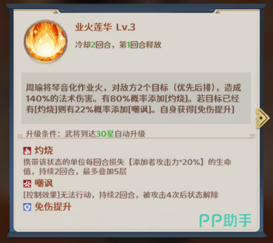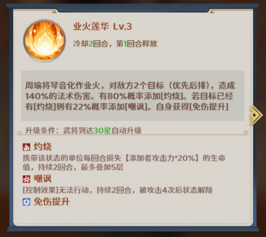 周瑜的核心主动技“业火莲华”于首回合即可释放,无需前置准备。该技能将琴音转化为业火能量,定向打击敌方后排两名单位,造成140%法术伤害。命中时有80%概率施加1层灼烧;若目标已处于灼烧状态,则额外触发22%概率赋予1层嘲讽。同时,周瑜自身获得1层免伤效果。当星级升至30星后,该技能自动强化:灼烧每层造成周瑜攻击值20%的持续伤害,最多可叠加5层,两回合内即可形成高额递增式DOT(持续伤害)。而嘲讽效果属于硬控类机制,受控单位将强制承受4次我方攻击后解除,对前排角色具有显著牵制作用。