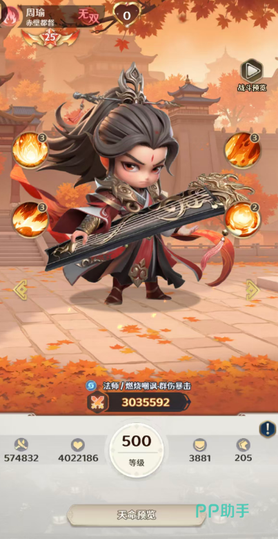 在《格斗三国志》中,周瑜作为高阶法师型武将,已可达成红色无双品质,其战术定位鲜明、机制丰富,在法系阵容中具备核心级战略价值。他并非单纯依靠单体爆发,而是通过多重灼烧叠加、群体控制与持续真实伤害构建起一套兼具压制力与续航能力的输出体系。