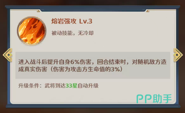 被动技“熔岩强攻”无冷却限制,每回合稳定触发。进入战斗后立即提升周瑜6%全伤害;回合结束时,随机选取一名敌人造成真实伤害,数值为周瑜当前生命值的3%。该效果在33星时进一步强化,真实伤害比例提升,确保其在持久战中始终保持可观的额外输出频率与压制节奏。