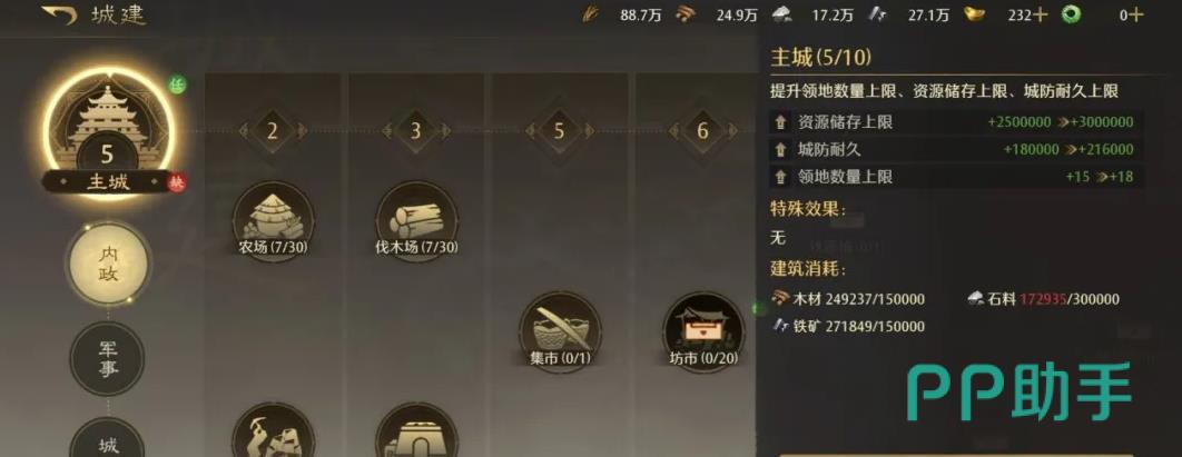 资源管理是前期成败的关键。常见误区包括过早分散投入、忽视主城优先级、盲目扩建附属设施等。作为一款三国题材策略手游,《九牧之野》强调“以主城为根基”的发展逻辑:开局应集中木材与石材,全力将主城升至5级;此阶段暂不建议同步铺开其他建筑,避免资源分流。主城达标后,再逐步拓展屯田、兵营、校场等功能区,确保每一分产出都服务于核心战力跃迁。