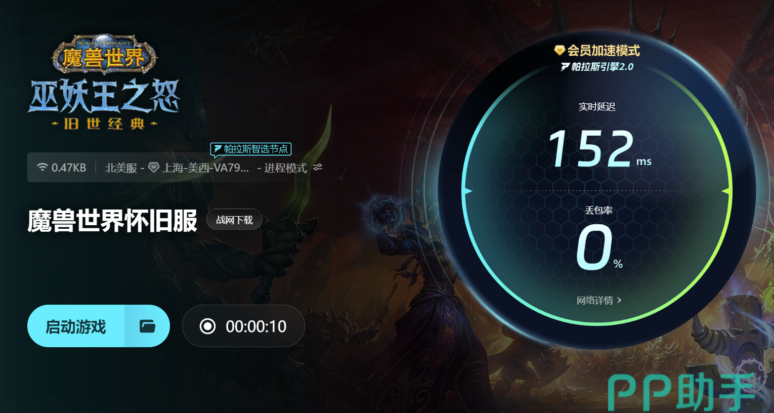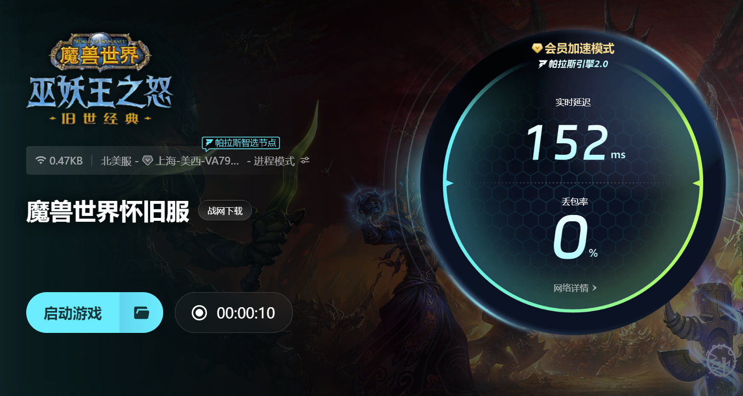 这款加速工具的使用方式十分的简单快捷,只需在搜索拉拉纳目中列找到魔兽世界怀旧服,点击“加速”按钮即可一键开启。它所采用的是智能节点分配技术,自动为伙伴们选择最优网络路径,省去了手动匹配节点的繁琐过程,加速效果显著且高效。其搭载的帕拉斯引擎2.0技术,能有效改善弱网环境下的游戏体验,让原本卡顿的网络变得如同电竞赛事现场般流畅,彻底告别掉帧烦恼。