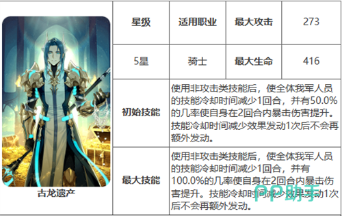 第七史诗古龙遗产的属性,适用的职业是骑士,它的最大攻击是能够达到273,而最大的生命是416,初始的技能是暴击率能够提升15%,如果在使用非攻击类技能,那么有50%的能够两回合内让暴击伤害提升。至于最大的技能则是在开展非攻击力技能的时候,有100%的机会在两回合之内能够暴击提升伤害,不过需要注意是两回合内仅能发动一次。