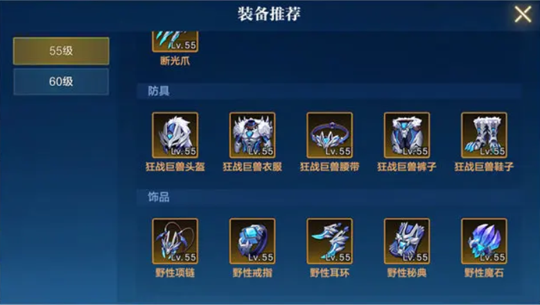 55级橙色装备分为史诗1与史诗2两个品质层级,仅史诗级装备具备套装属性。标准套装为五件套结构,集齐其中任意四件即可激活套装效果。左右槽位分别对应防具套与饰品套,二者均以提升伤害输出为核心功能;而魔石与秘典所附加的会心率、会心伤害等属性,对爆发流派尤为关键。