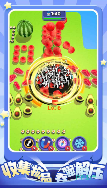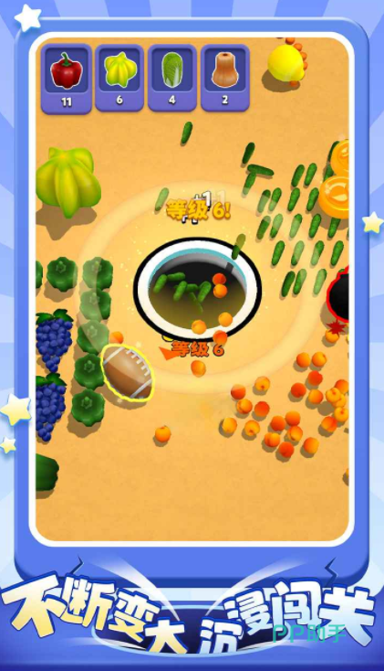 在这款休闲闯关游戏中,你将扮演一只可爱的小鼹鼠,目标是为即将到来的季节储备足够的食物。凭借独特的黑洞能力,你需要在限定时间内尽可能多地收集散落在场景中的各种美食。进入关卡后,可自由挑选喜欢的地图环境,随后通过手指滑动控制黑洞移动,吸附周围的食物资源。每种食物对应不同的积分值,吸收的数量越多,累计得分也就越高,达到指定分数即可成功通关。