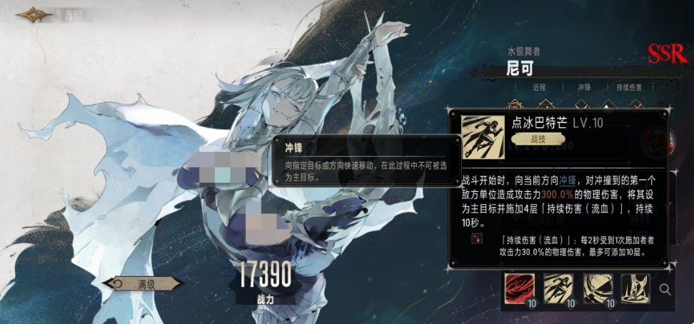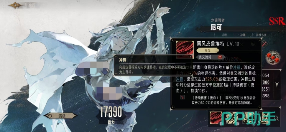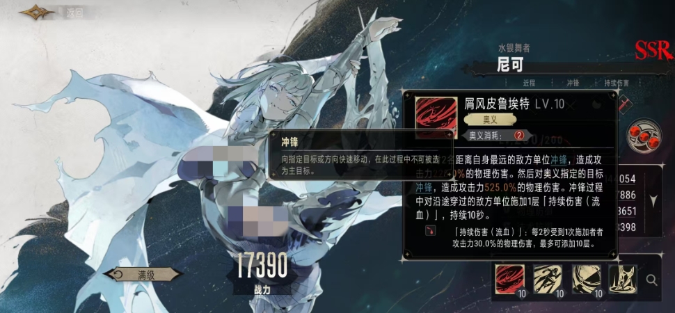 她的奥义技能是其战力的核心体现,这一技能能够让尼可依次对两名距离自身最远的敌方单位发起冲锋,每次冲锋都能造成攻击力225%的物理伤害,而更为惊人的是尼可在完成这两次冲锋后,还会对奥义指定的目标进行一次更为猛烈的冲锋,这次冲锋能造成攻击力525%的物理伤害,这样的爆发力还是很强的,更重要的是尼可在冲锋的过程中,沿途穿过的所有敌方单位都会获得一层持续伤害流血效果,持续时间长达10秒钟。