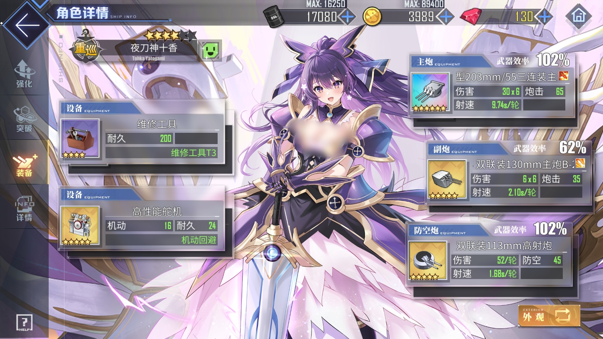 专属兵装“鏖杀公”进一步强化了夜刀神十香的战场韧性,为其提供永久性的8%减伤效果。每次成功击破敌舰后,可叠加一层8%的暴击率增益,最多叠加三层,且增益效果可持续至战斗结束,不会因受伤或状态变化而失效。在装备搭配方面,推荐使用标准彩色重巡主炮,若暂未获取也可选用欧根炮或巴尔的摩炮替代;副炮推荐每月可兑换的B13,或性能稳定的金128;防空炮建议配置泛用性强的金113;设备栏则推荐金舵机与维修工具的经典组合,兼顾机动性与续航能力。