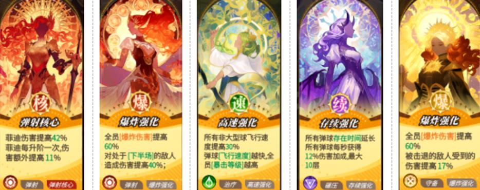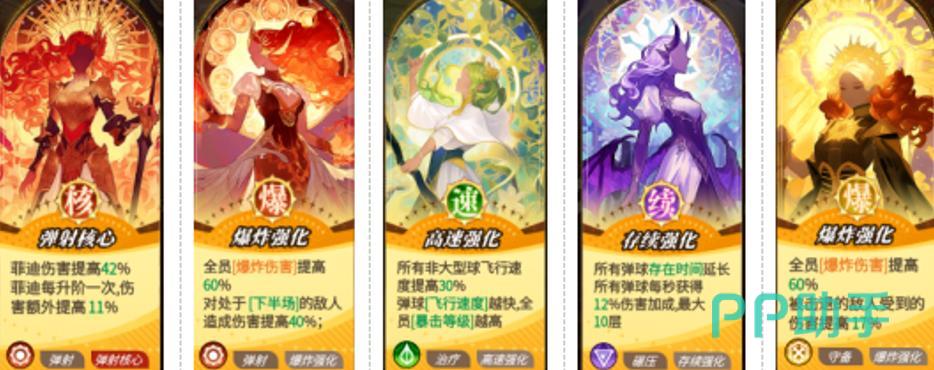 菲迪——主输出核心 技能机制以弹球命中后连锁爆炸为核心,清杂与单体压制能力兼备。星座推荐射手座,可提升基础伤害,并通过脚印持续触发召唤物协同增益,显著放大实际DPS。幻影球技能建议选择“同步强化”(侧重前期成型速度)或“熟练发射”(侧重中后期爆炸密度)。局内女神buff优先选取“弹射核心”与“爆炸强化”,角色培养优先级为全队最高。