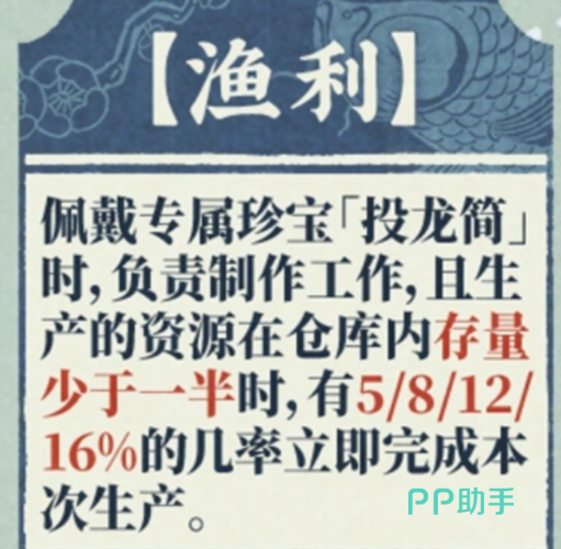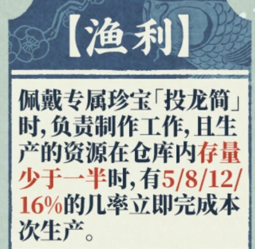 “渔利”需配合珍宝“投龙筒”激活,仅在佩戴状态下生效。当执行制作任务且目标资源库存不足一半时,本次生产有5%、8%、12%、16%概率直接完成,显著缩短等待周期,优化资源流转节奏。