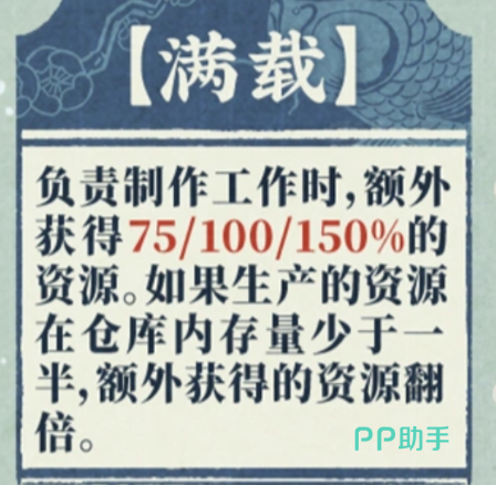 钟雪渔拥有两项专属技能:“满载”与“渔利”。其中,“满载”效果作用于制作类工作,依据技能等级分别提供75%、100%、150%的额外资源产出;当所生产资源在仓库存量低于50%时,该加成翻倍生效。