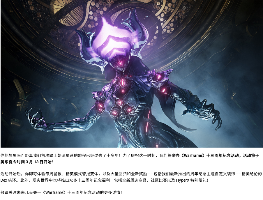 《星际战甲》正式迎来第十三周年庆典,作为全球范围内广受好评的科幻题材多人在线动作游戏,本次周年庆以丰富内容、深度玩法与高价值回馈为核心,持续引发玩家社区热议。本文将系统梳理2024年十三周年活动要点,涵盖登录福利、限时任务、新战甲实装及网络体验优化方案。