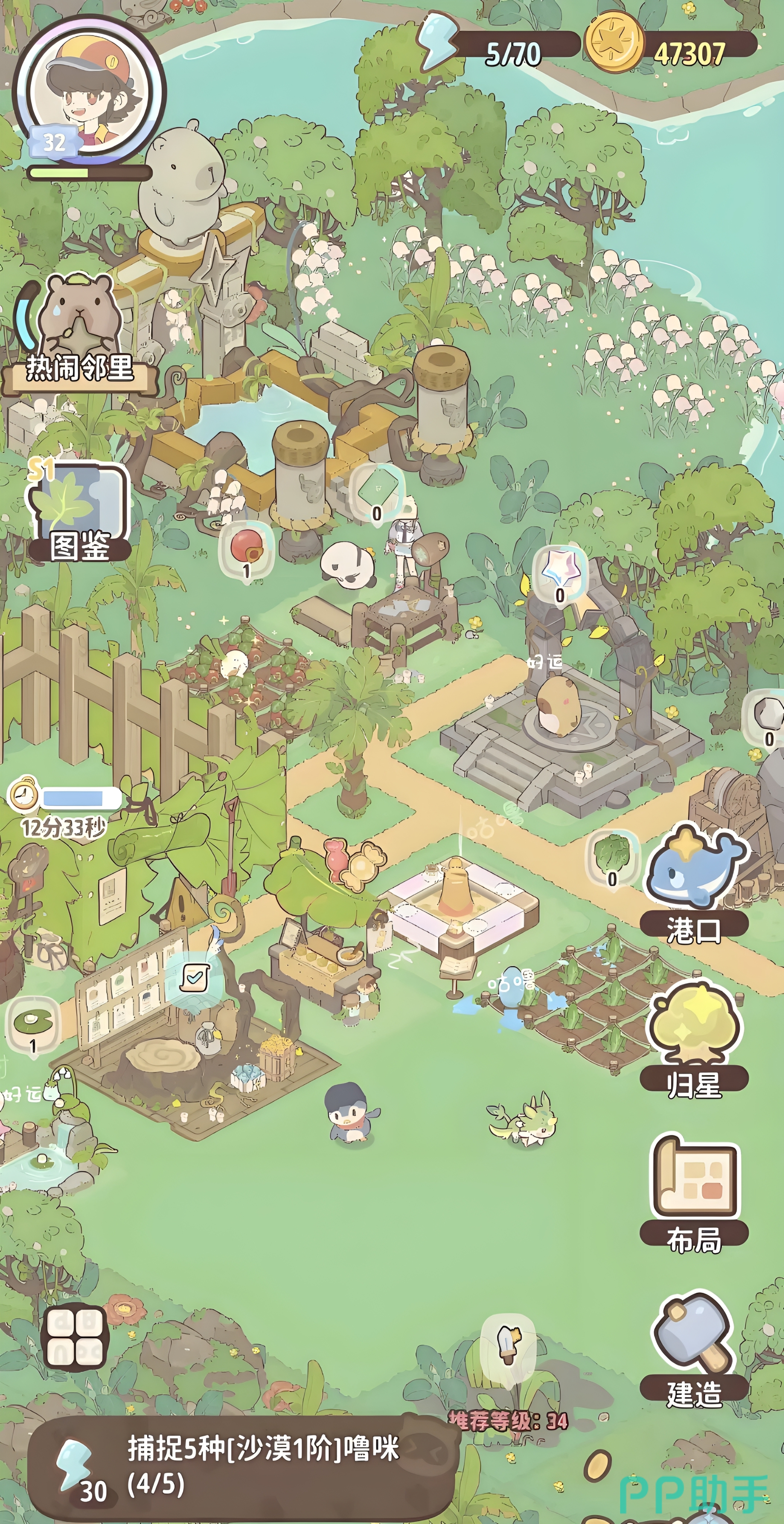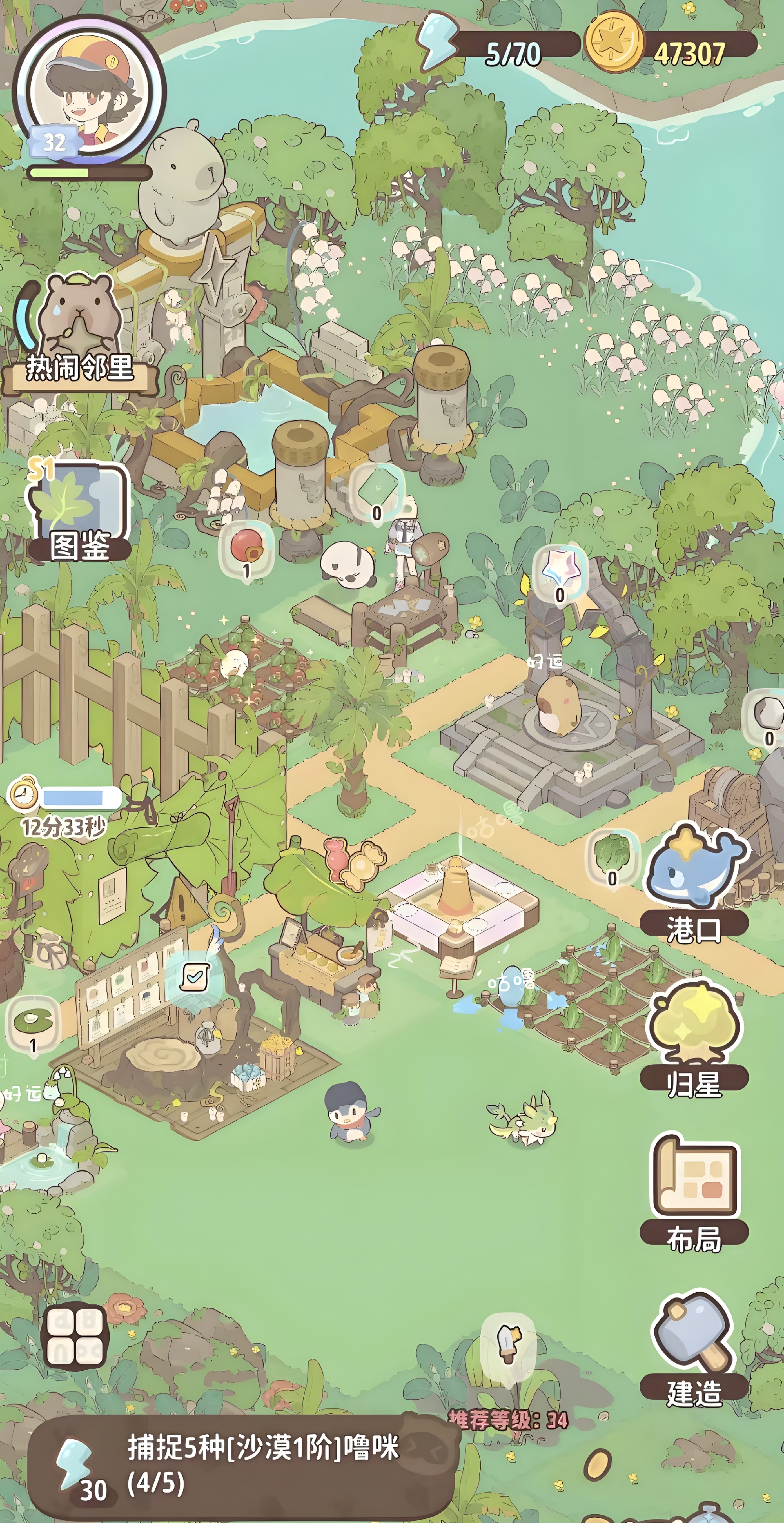 本作采用柔和低饱和色调与流畅手绘轮廓相结合的视觉语言,构建出林间小径、海岸沙滩、幽深峡谷等百余处动态插画级场景。游戏中登场噜咪超百只,每只均拥有独立设定与专属技能,角色设计融合网络流行文化元素,在保留童趣基调的同时自然嵌入当下热梗,增强年轻用户共鸣感。初见易被误判为沙盒建造类作品,实则以“噜咪捕捉+工坊经营”为核心机制——玩家需在开放地图中发现并收服不同噜咪,将其安置于各类工坊中参与生产协作。