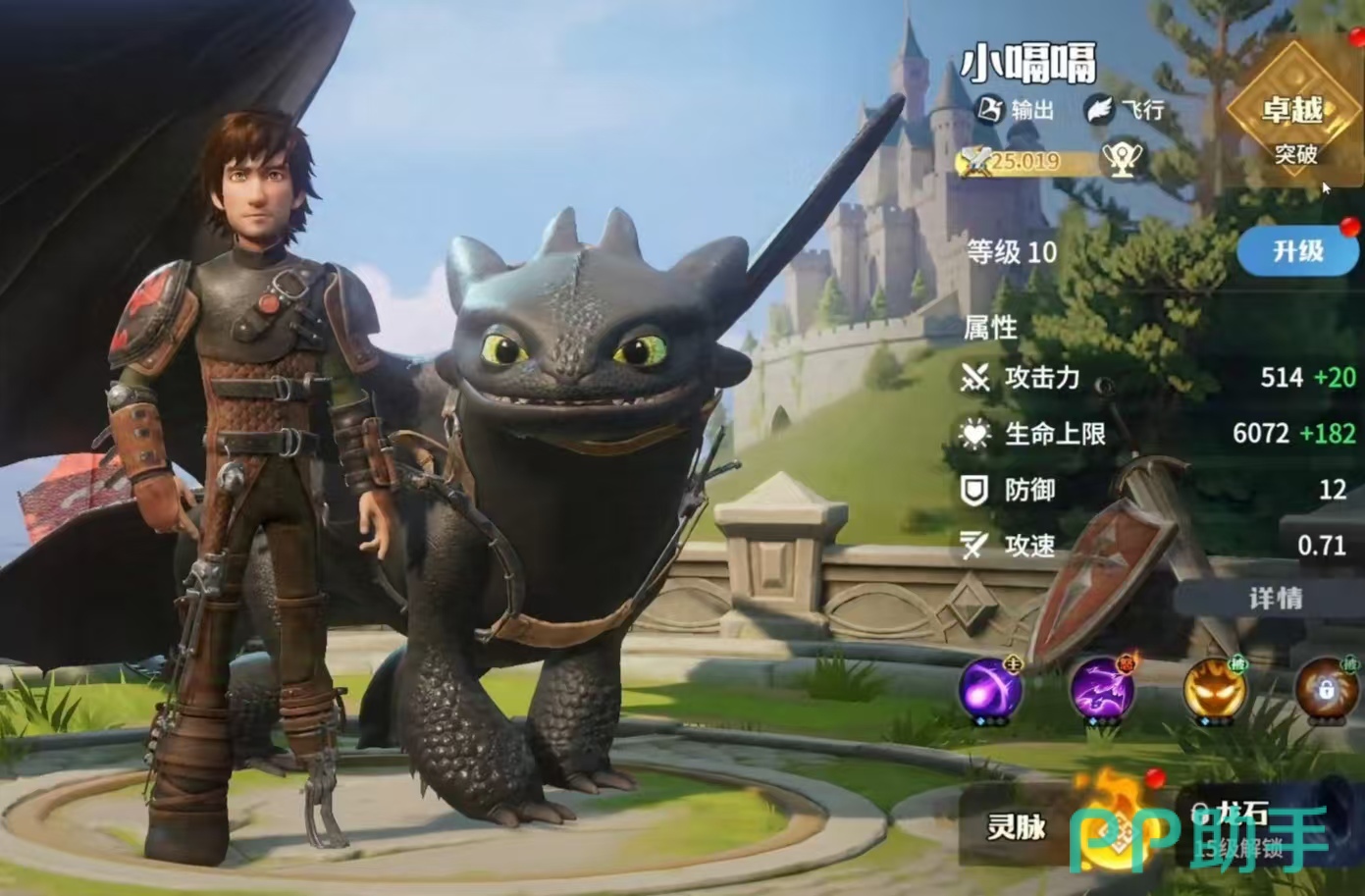 小嗝嗝的主动技能是喷吐等离子弹,无牙仔是他的坐骑,随机发射等离子弹,大招怒气技能是音爆奇袭,一段直线牵引有聚怪的作用,不仅有控制还有超高的爆发伤害,灵脉前期选择走上线,50级之后选择走下线,龙石推荐选择他的本命龙石适者生存用来提升暴击率,在没抽到之前可以选择通用龙石弱点感知将暴击率拉满。
