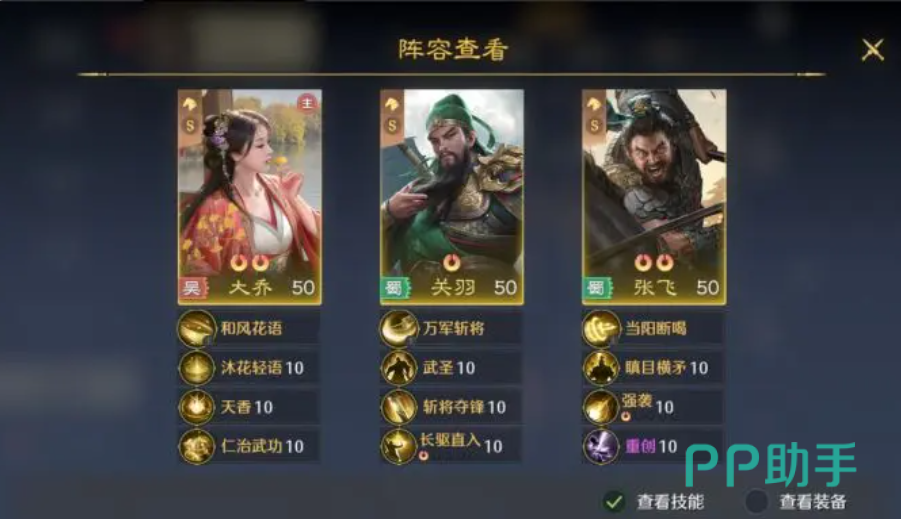 除东吴体系外,另一套高适配性方案为“桃园平替队”:大乔 + 关羽 + 张飞。该阵容同样以大乔为战术中枢,发挥治疗与男性增伤特性。关羽可通过常规抽卡获取,张飞则为次日登录奖励,获取稳定且无随机性。若玩家已拥有刘备,亦可替换关羽形成完整桃园体系,但即便使用平替组合,在前期推图、精英关卡及日常挑战中仍具备出色表现力与稳定性。