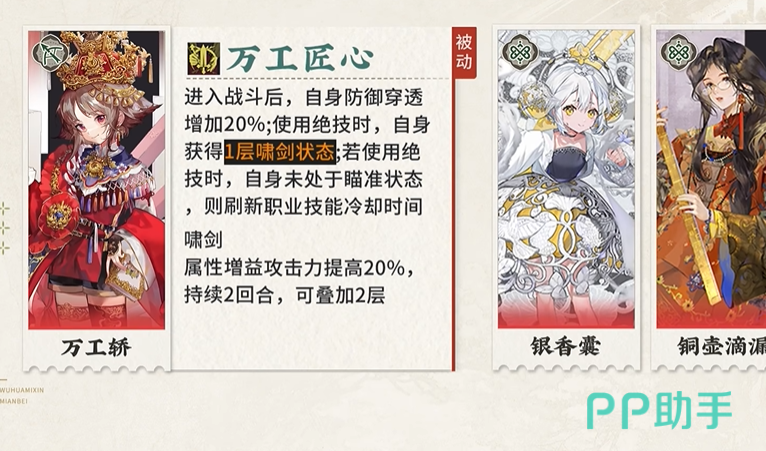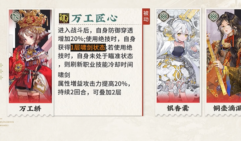 被动技能“朱金漆雕”进一步强化了万工轿的输出能力,敌方每存在一层“避让”,自身攻击力便提高一定百分比,最多可叠加数层,且连击对敌方单位造成伤害时,该单位每存在一层“避让”,还会受到基于万工轿自身攻击力百分比的额外物理伤害。
