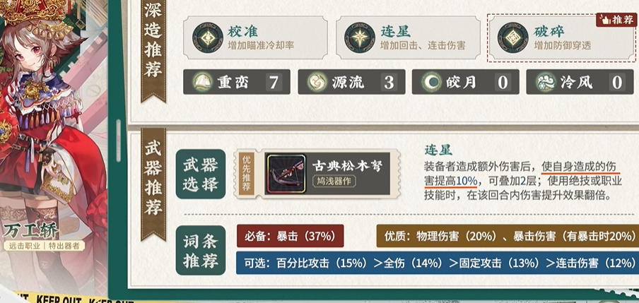 常击技能“喜乐喧天”能对选定的敌方单体造成基于自身攻击力百分比的物理伤害,是触发后续连击效果的基础,职业技能“锦绣红装”使用后,万工轿可获得一次不可移动的再行动机会,并进入瞄准状态,在瞄准状态下,最大攻击距离增加四格,极大地提升了攻击范围,且行动结束后退出该状态,为战斗中的灵活输出提供了保障。