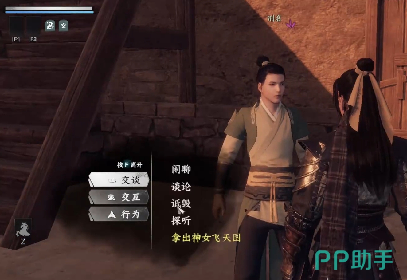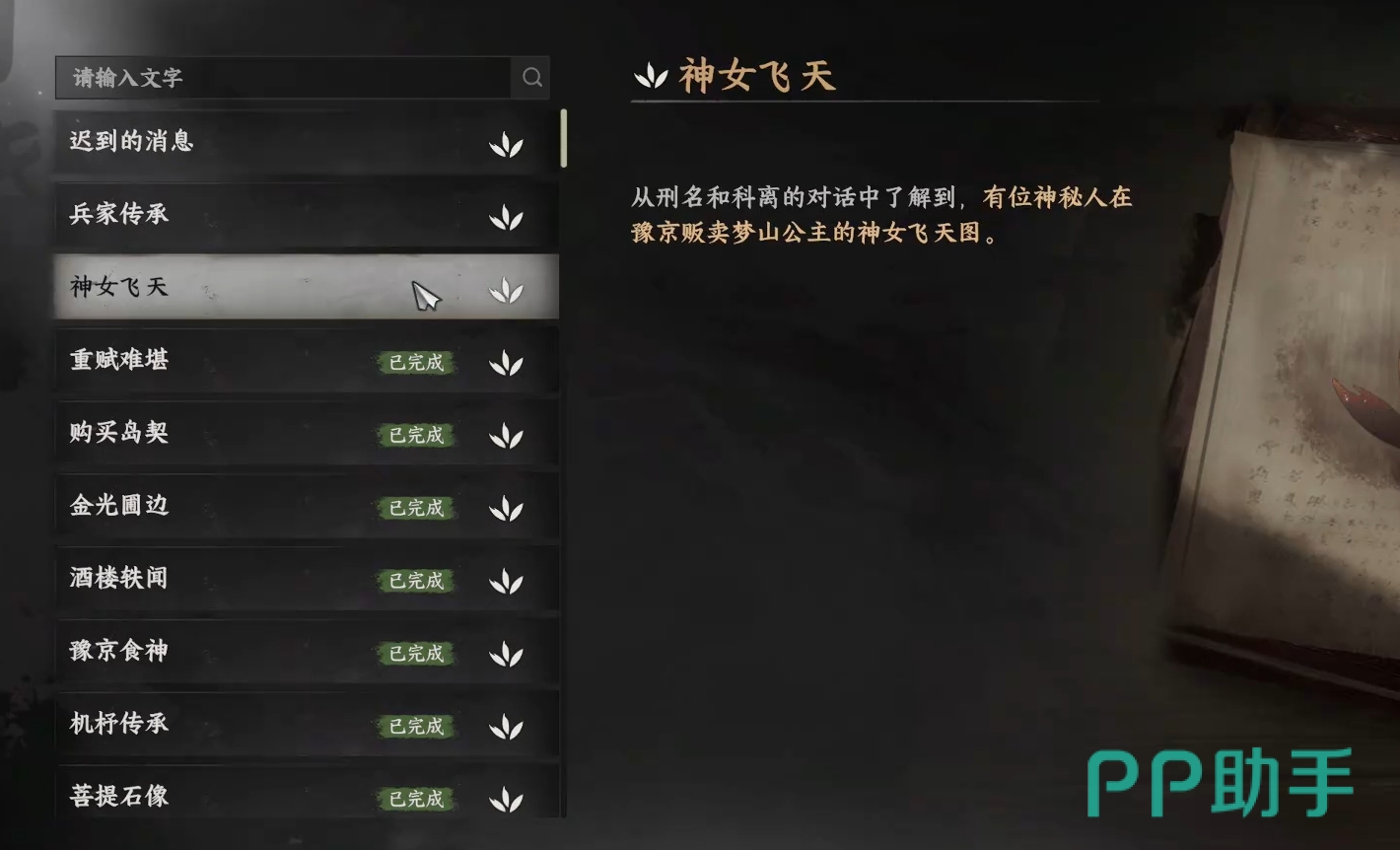 任务起始地点位于雁洲。抵达后,前往地图坐标(1594,964)处找到NPC刑名。靠近后会听到他与另一人争论一幅画中的女子身份。此时需耐心等待,直到刑名出示证据,证明画中人为胡伶公主梦山,并与其完成对话互动。成功后将触发“灵光一闪”效果,正式接取“神女飞天”奇遇任务。随后可在江湖游记的奇遇列表中查看该任务进度。