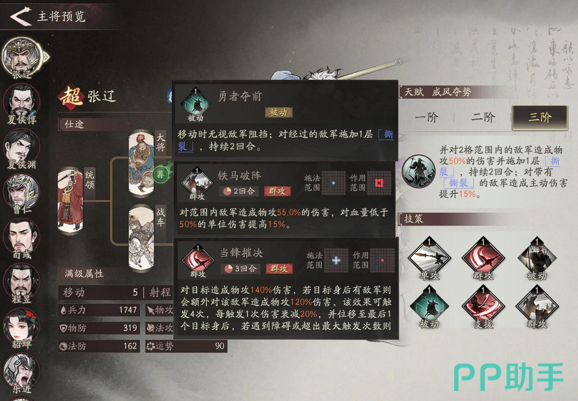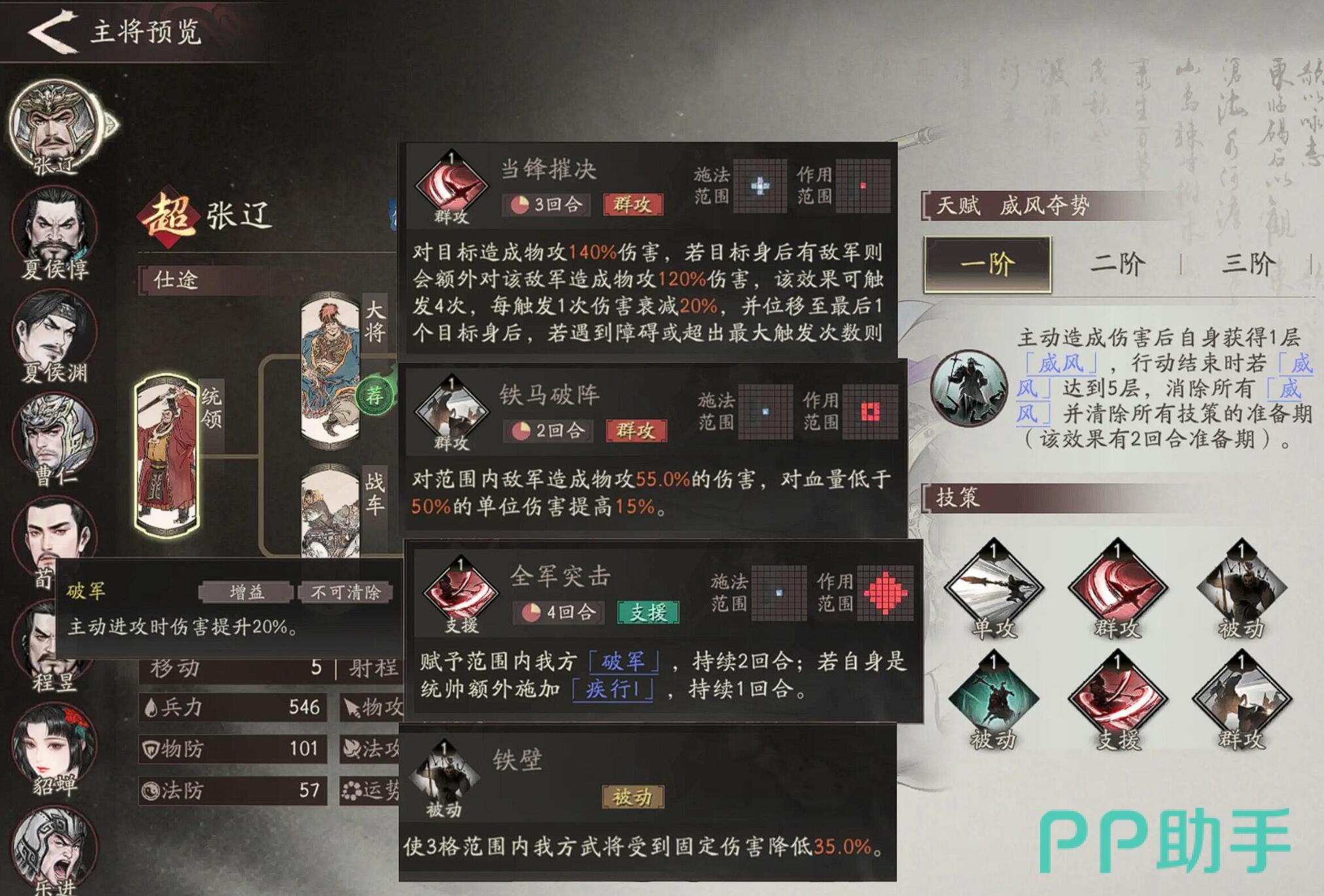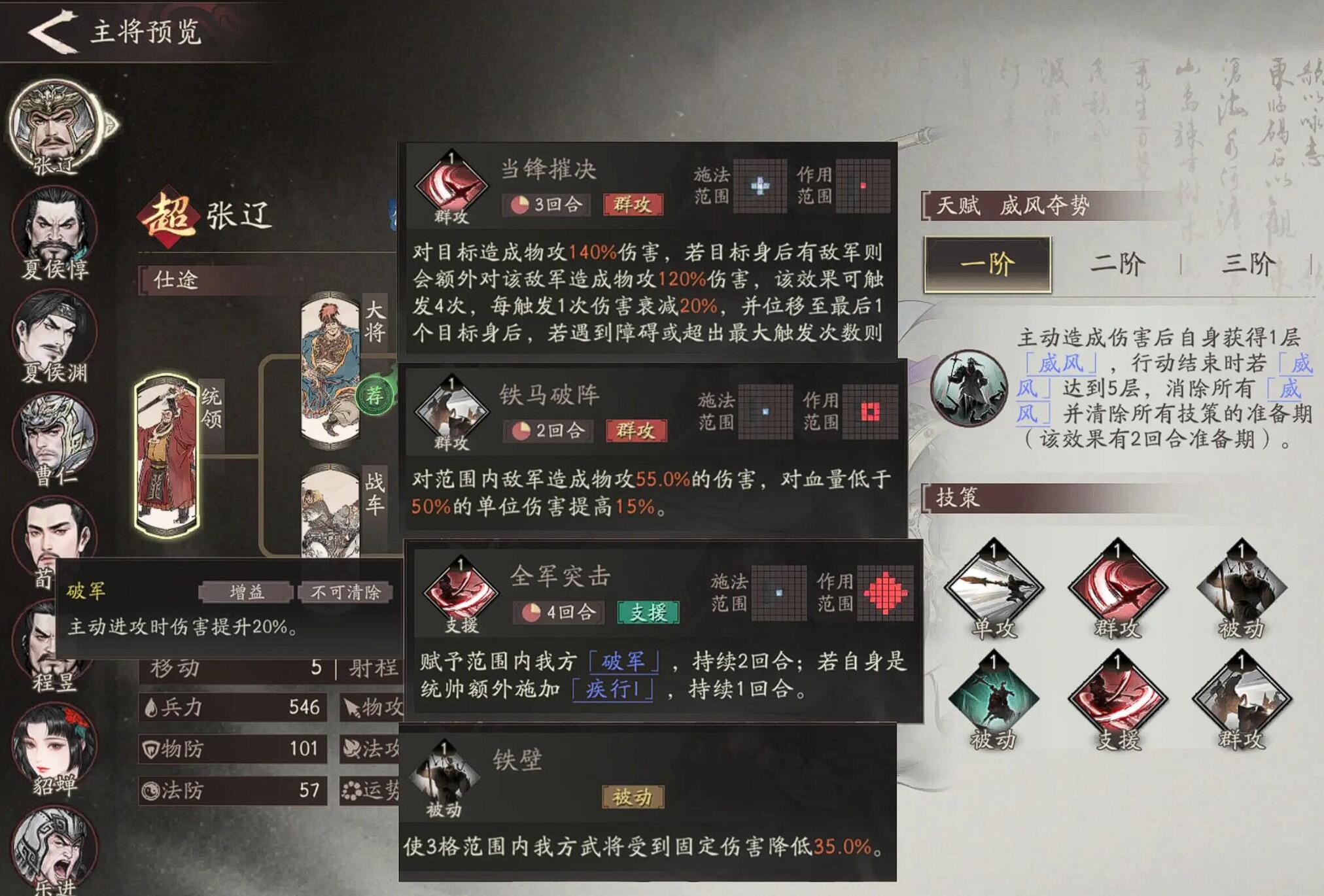 天赋方面建议优先解锁二阶“再行动”效果,使用技能后有30%概率再次行动,此天赋通过升星激活,需要消耗20个张辽碎片与5000银币。三阶天赋“威风夺势”同样关键,主动攻击时不触发敌方反击,且对两个以上单位命中后获得无法选中效果,属于高阶必备选项。若主打PVE爆发流派,应优先加点当锋摧决和勇者夺前;若侧重PVP控制体系,则主升当锋摧决并搭配减治疗类技能,强化团队压制力。注意PVP与PVE加点思路不同,切勿混用。