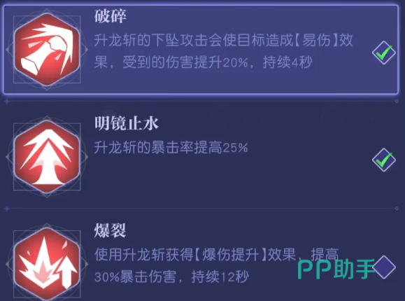升龙斩的核心机制为“挑飞+重砸”双重控制链:先将前方敌人击飞,再垂直下坠造成171%基础攻击伤害,并附带1500+点固定物理伤害。其伤害具备等级压制增益——当技能等级高于目标等级时,每高1级可提升5%或10%总伤。符文配置方面,推荐三选组合:“破碎”强化下坠阶段硬直伤害,并使后续攻击提升20%输出;“明镜止水”提供25%暴击率加成;“爆裂”则在提升30%暴击伤害的同时,支持连续12秒高频释放。三者协同,使升龙斩在暴击覆盖率与爆发密度上均达到战术最优。关于套装过渡,40级前仍适用“拓荒”两件套,兼顾技能启动与续航需求。