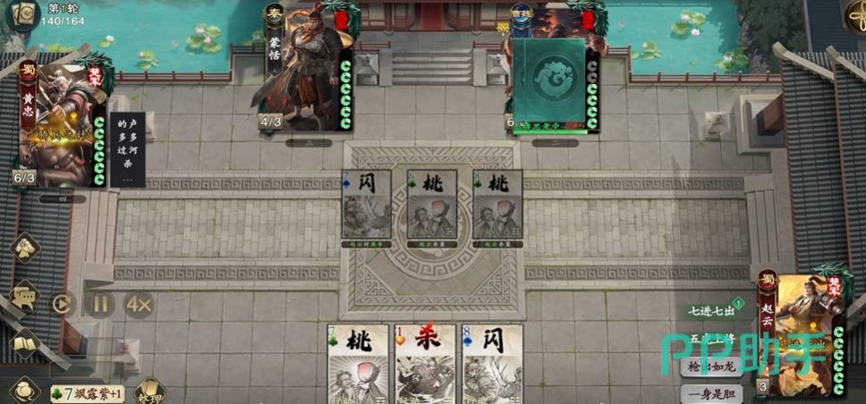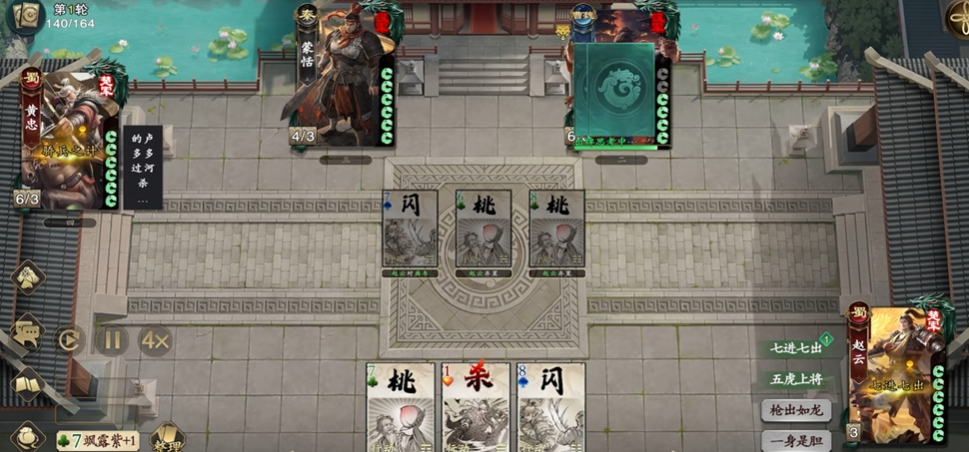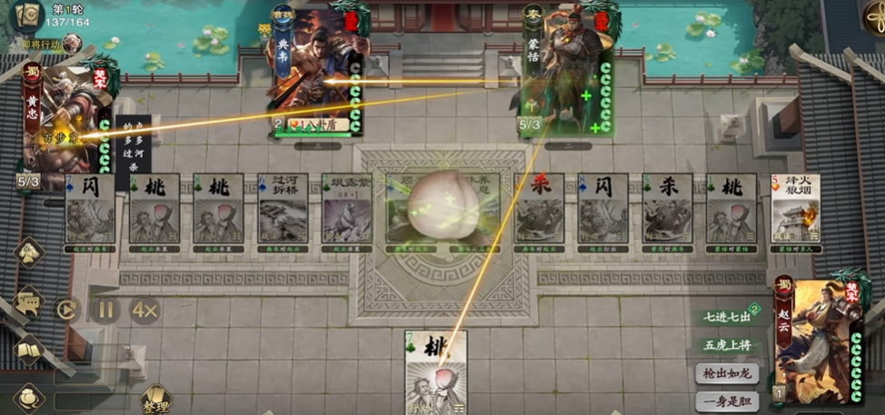 第三个技能“骄兵之计”赋予了黄忠出色的反制能力。当其成为其他角色使用【杀】的目标时,可在响应阶段做出两种选择:一是放弃摸牌机会,直接对攻击者回敬一张【杀】;二是选择不反击,使下一次因该技能获得的摸牌数量增加一点,增益持续至下一回合开始前。
