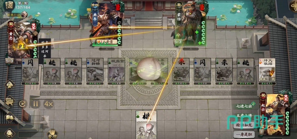 第二个技能“百步穿杨”是一个强力的进攻手段。当黄忠发动该技能后,可立即对指定目标使用一张【杀】,并且此次攻击具备强制命中特性,目标无法通过闪避或其他方式规避伤害,极大地提升了其打击效率和战场压制力。