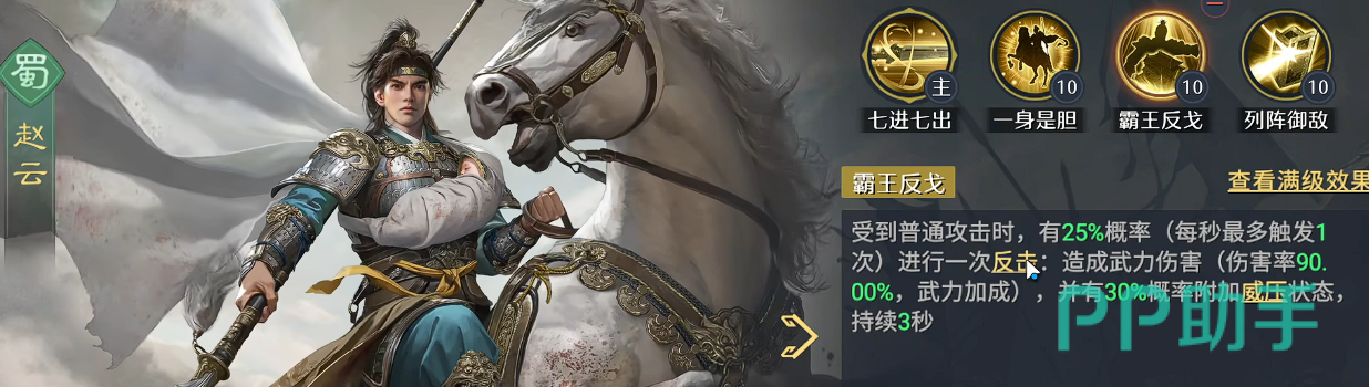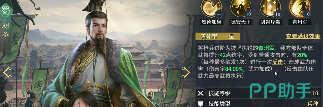 辅助位推荐选用刘备。作为蜀国阵营通用型支援武将,刘备与赵云存在高度技能契合:其主动效果可大幅提升赵云的武力值;同时,其技能还能将全队枪兵转化为青州兵,不仅增强基础武力,更赋予全体20%的额外反击触发概率。这一机制与赵云的被动形成双重反制覆盖,大幅提升阵容的整体反打密度与容错空间。