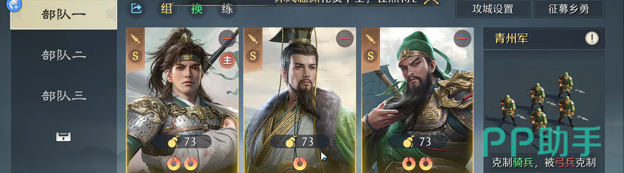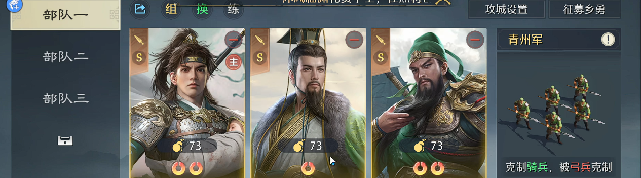 兵种配置统一采用骑兵。一方面,骑兵与赵云的突进特性高度匹配,便于在反制后迅速衔接压制;另一方面,在刘备技能加持下,骑兵亦可转化为青州兵,同步获得武力加成与20%反击概率,实现多单位协同反打,真正达成“一触即发、连环反制”的战术闭环。
