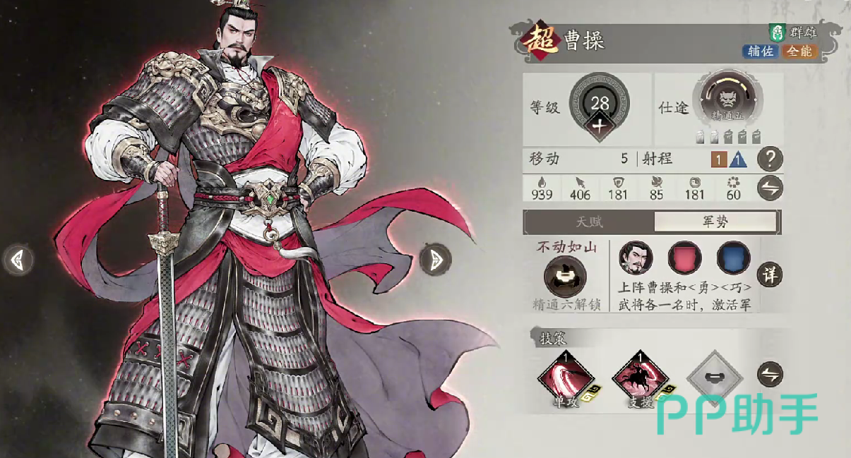 曹操:作为团队统帅型武将,他在阵容中扮演着关键支撑角色。其技能不仅能为全体友军提供15%的攻防属性加成,还可释放战法延长战斗持续时间,提升整体作战效率。由于具备强大的群体增益能力,曹操几乎适用于所有战斗场合。同时,当他恢复战意后,还能对敌方造成可观的额外伤害,是值得优先培养的核心辅助人物。