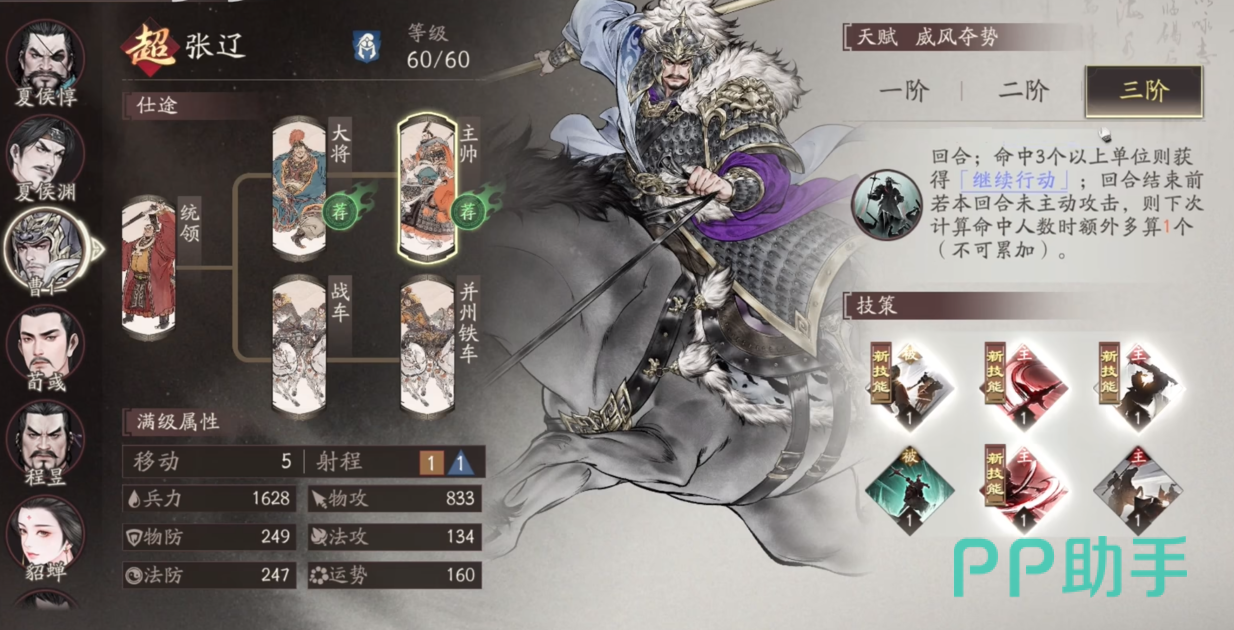 张辽:作为一名具备刺客特性的骑兵单位,他在战场上展现出极强的突袭能力。其技能可对直线路径上的敌人造成递增式伤害,命中目标数量越多,总输出越高。此外,他还能瞬移至最后一名被击中的敌方身后,发动致命一击,实现收割效果。凭借出色的爆发与机动性,张辽无论是在新手开荒阶段还是高端对战场景中,都具有极高的出场价值。