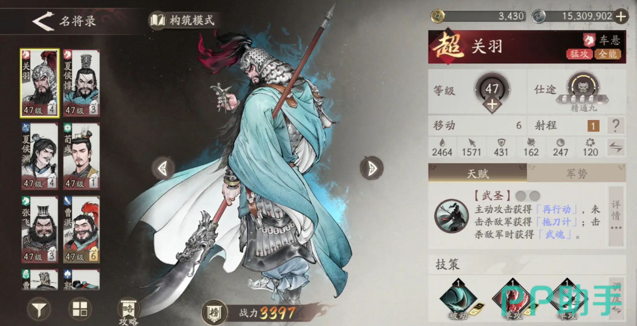 关羽:定位为超品级刺客骑兵,兼具攻击与生存能力。在使用主动技能时,能够对多个敌方目标造成连续物理打击,并具备穿透效果,显著提升清场效率。配合被动技能,可降低敌人的警戒状态,使其更容易受到后续技能压制。当主被动技能衔接得当时,往往能在关键时刻逆转战局,成为决定胜负的关键力量。
