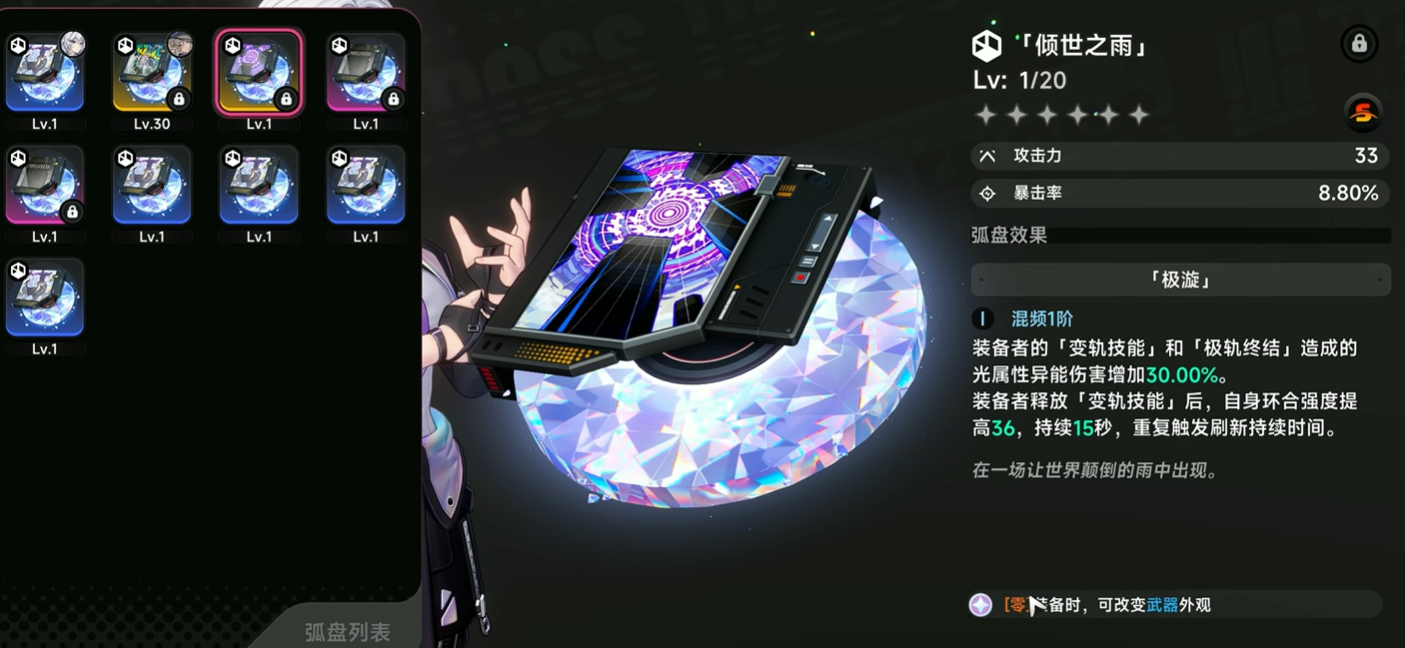若计划将主角培养为主力输出核心(主C),此弧盘是当前版本中兼具成长性、机制适配性与风格统一性的优选方案。“异环·倾世之雨”本质上是一把属性扎实、上限可观的太刀型弧盘,满级后物理增益幅度显著,对主C流派构建具有实质性支撑作用。